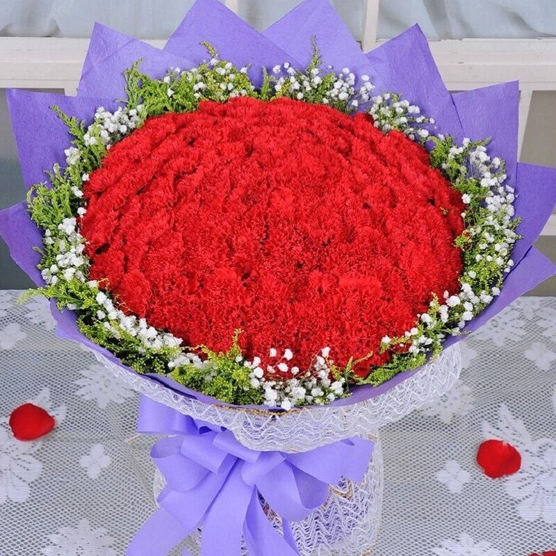 花 材:99朵红色康乃馨,黄英草、满天星外围环绕。