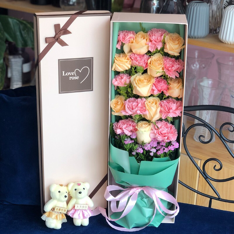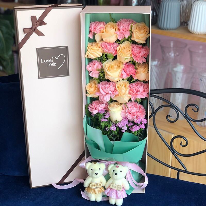 花材: 19朵康乃馨玫瑰混搭(11朵粉色康乃馨,8朵香槟玫瑰),2只小熊,搭配石竹梅点缀。