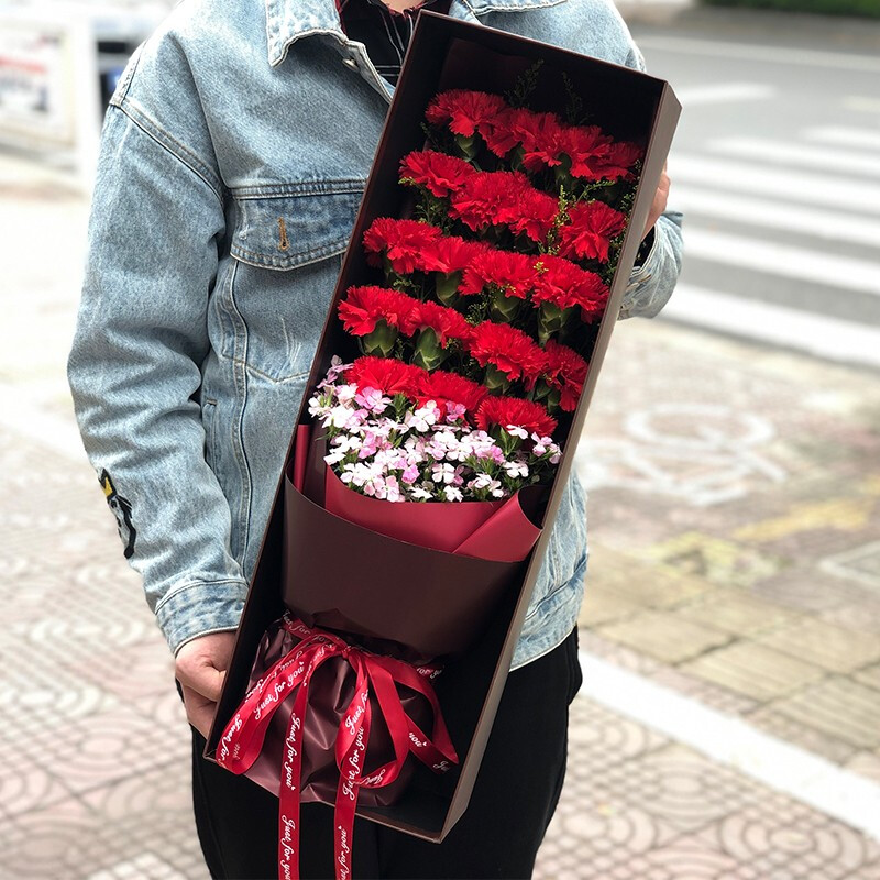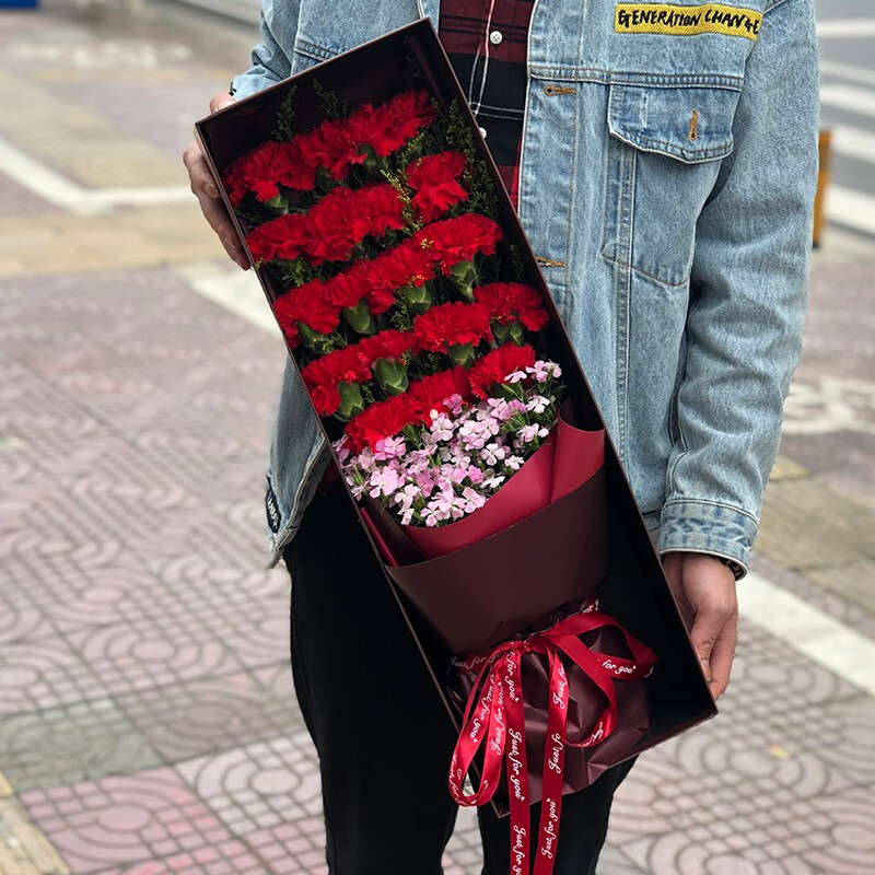 花材: 19朵红色康乃馨,2只小熊,搭配石竹梅装饰。