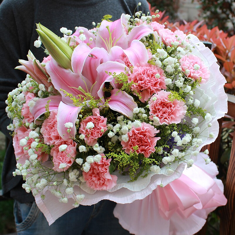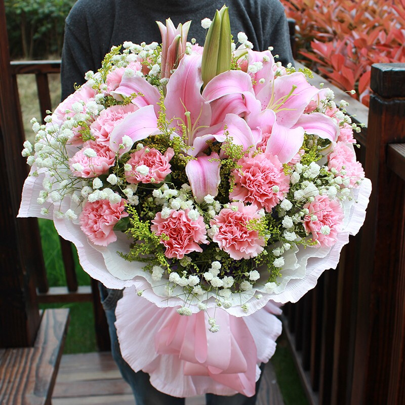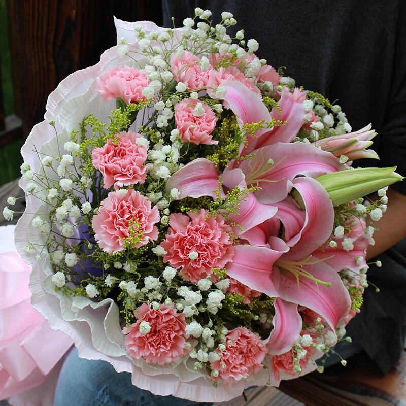 花 材:19支粉色康乃馨,2支粉色多头香水百合,搭配满天星、黄英装饰。