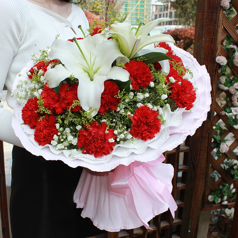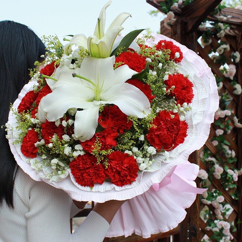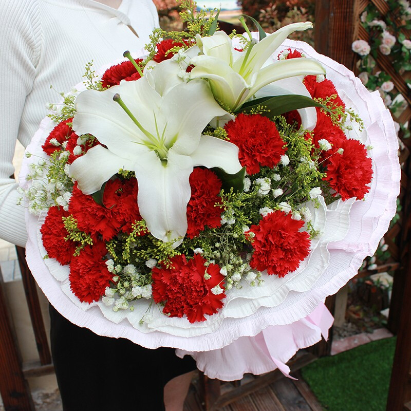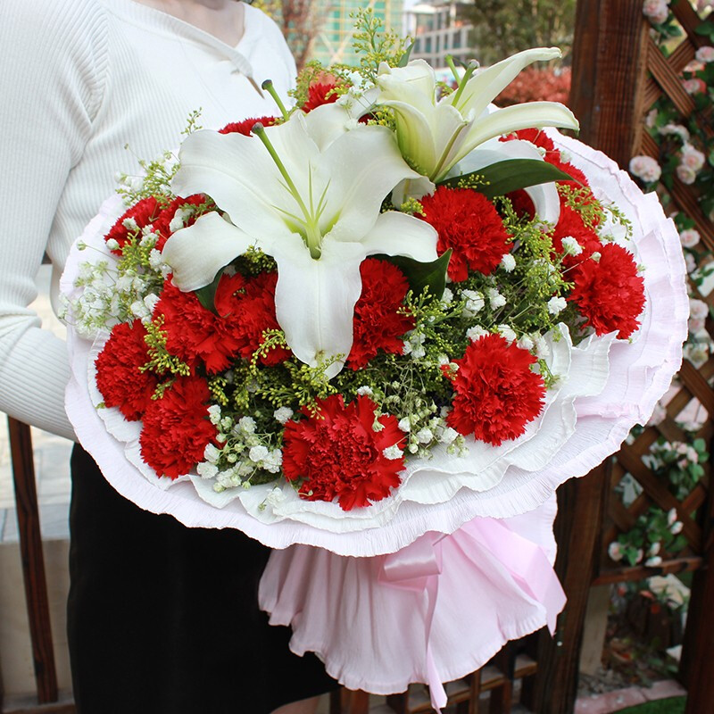 花 材:19朵红色康乃馨,1支白色多头香水百合,搭配满天星、黄莺草装饰。
