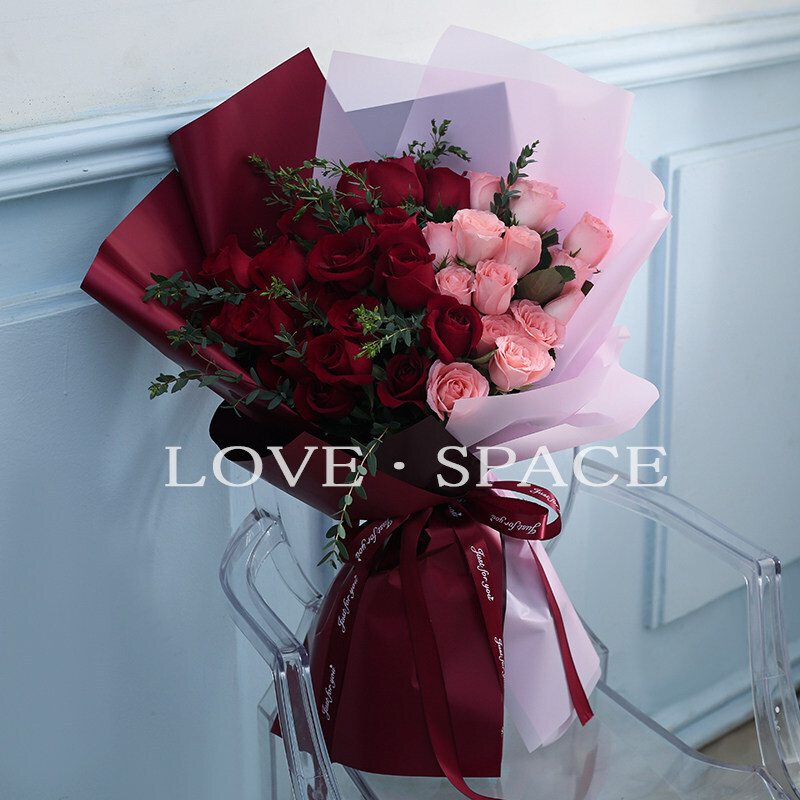 花 材:精选36朵红色、粉色玫瑰(一半红色一半粉色),搭配尤加利叶装饰。