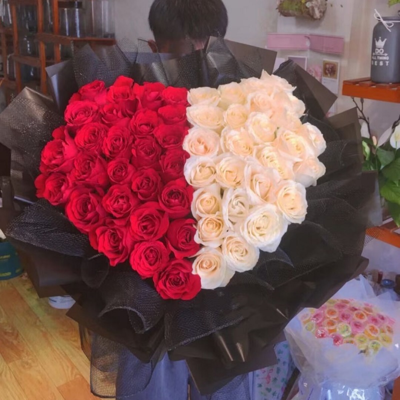 花 材:52朵精品玫瑰,左边26朵红玫瑰,右边26朵香槟玫瑰,心形形状造型。