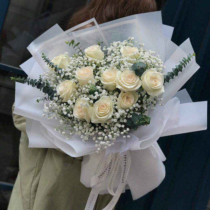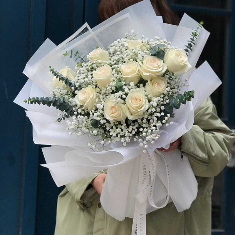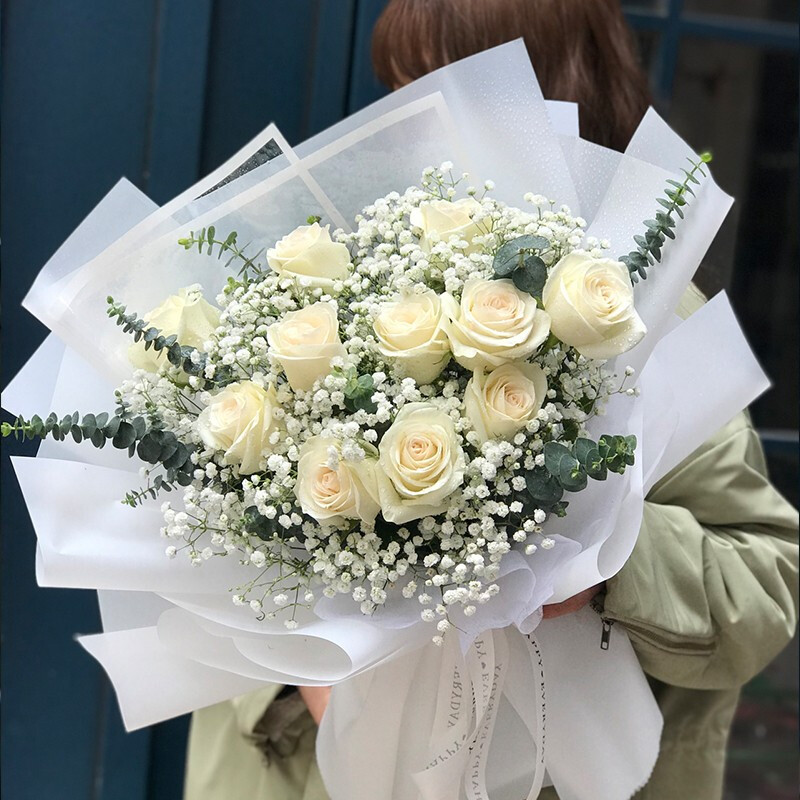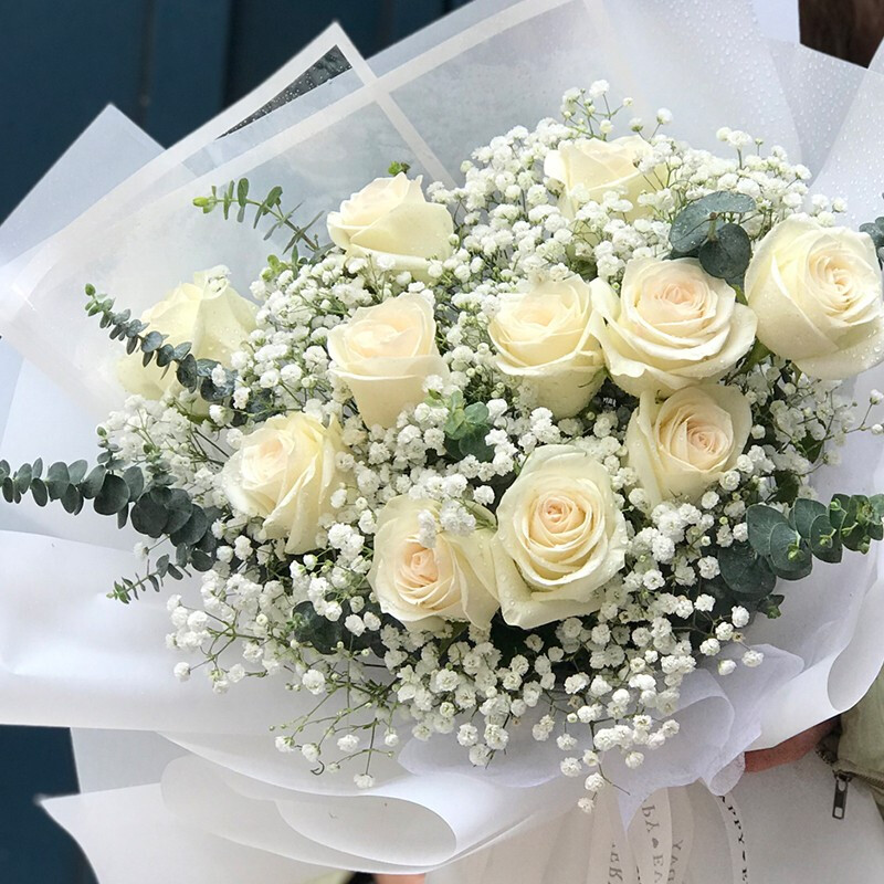 花 材:11朵精品白玫瑰,搭配大量白色满天星,尤加利叶装饰。