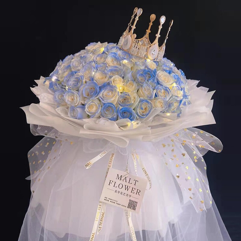 花 材:99朵极品碎冰蓝玫瑰球形包装,搭配皇冠,灯串装饰。(珍贵稀少花材,请提前预订或咨询花艺师)