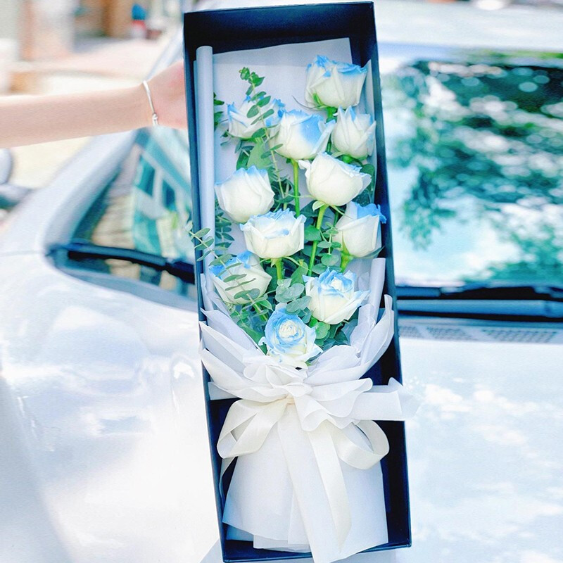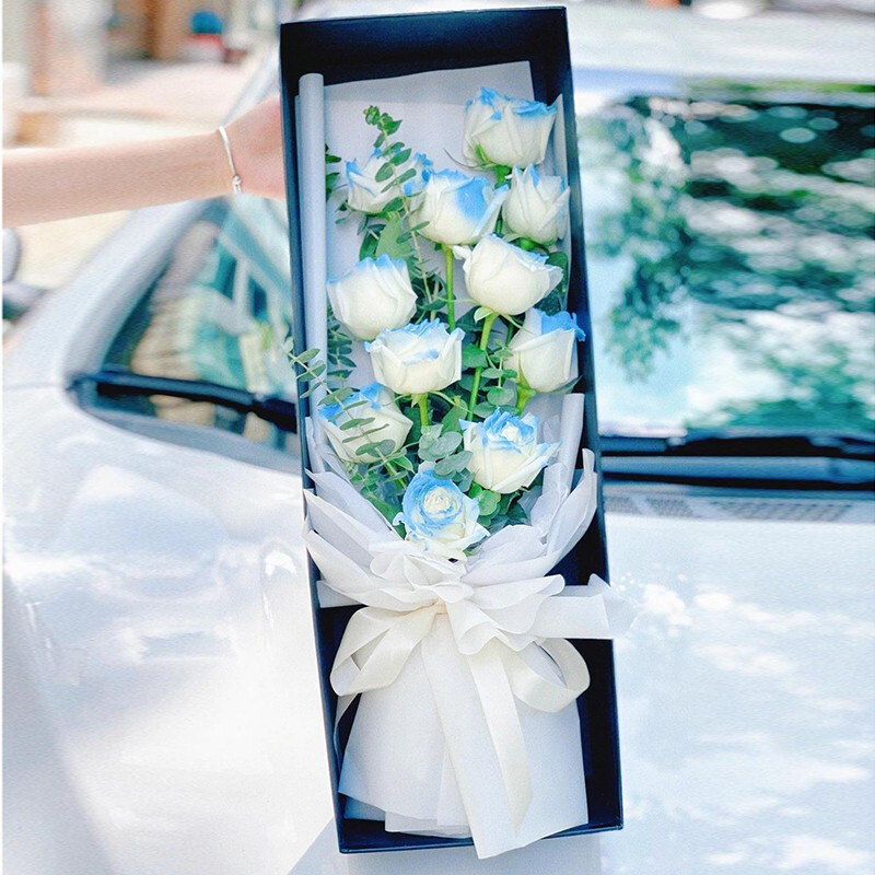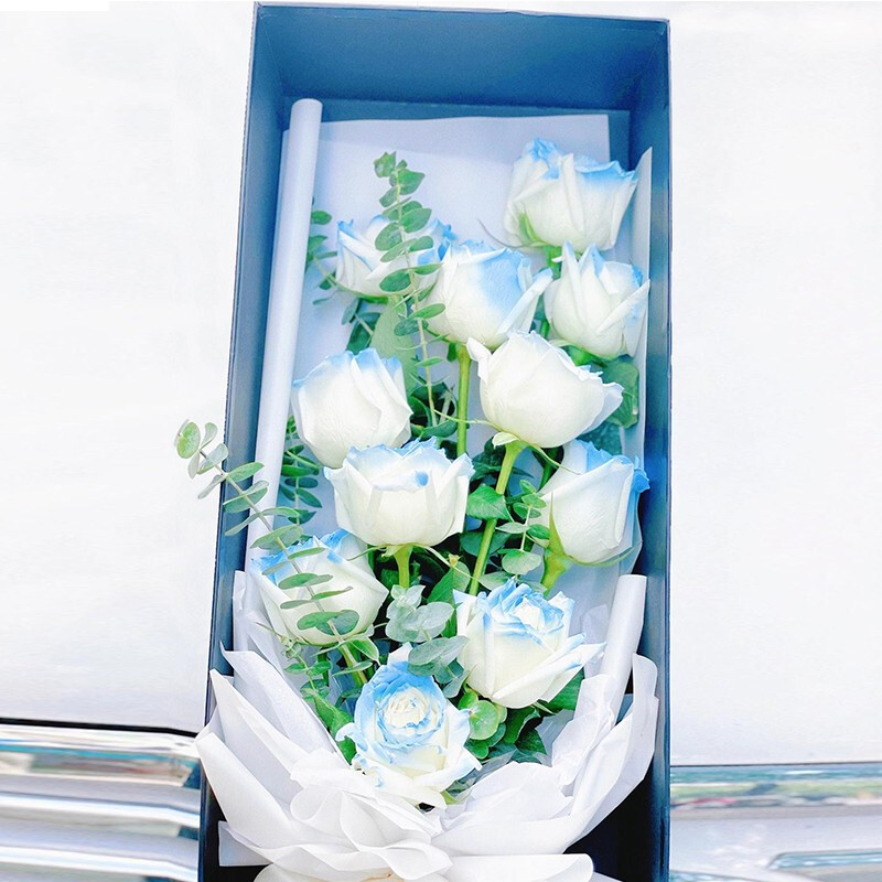 花 材:11朵精品碎冰蓝玫瑰,搭配尤加利叶装饰。