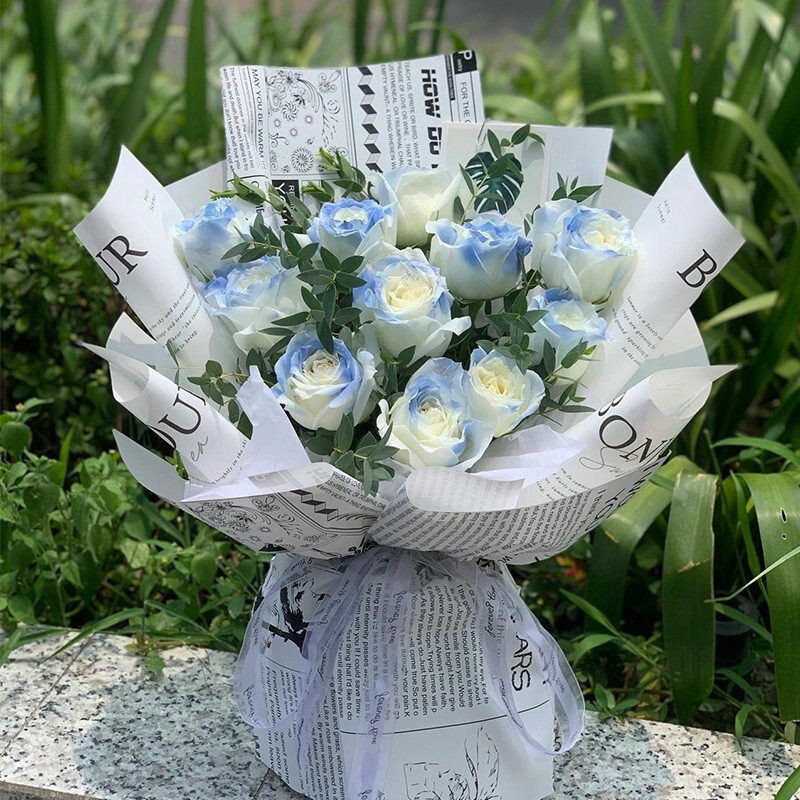 花材: 11朵碎冰蓝玫瑰,搭配尤加利叶装饰。(珍贵稀少花材,请提前预订或咨询花艺师)