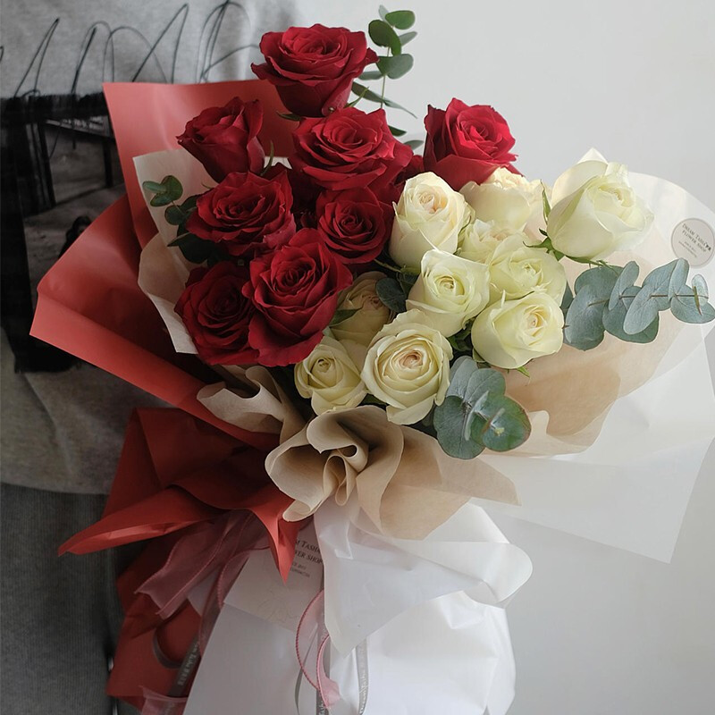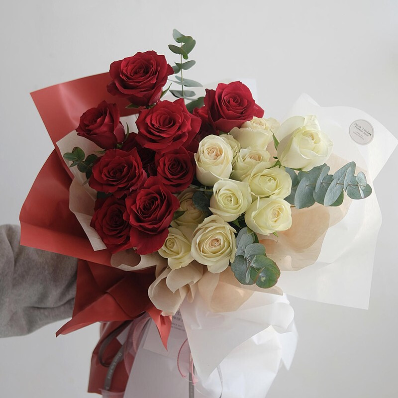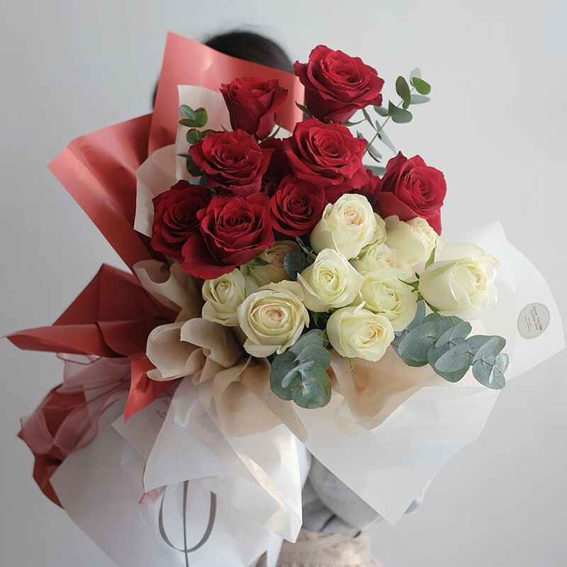 包装: 雪梨纸纸内衬,红玫瑰的半边外围用红色韩素纸包装,香槟色玫瑰的半边外围用白色韩素纸包装,红色+银灰色缎带花结。