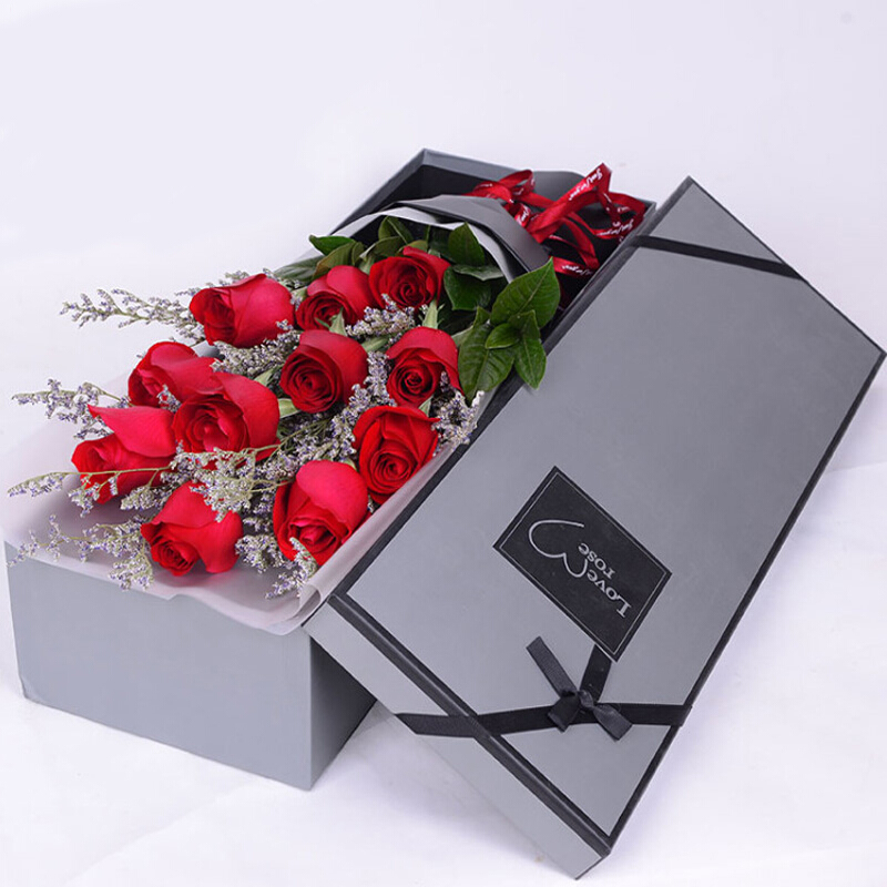 花材: 11朵红玫瑰,搭配情人草装饰。