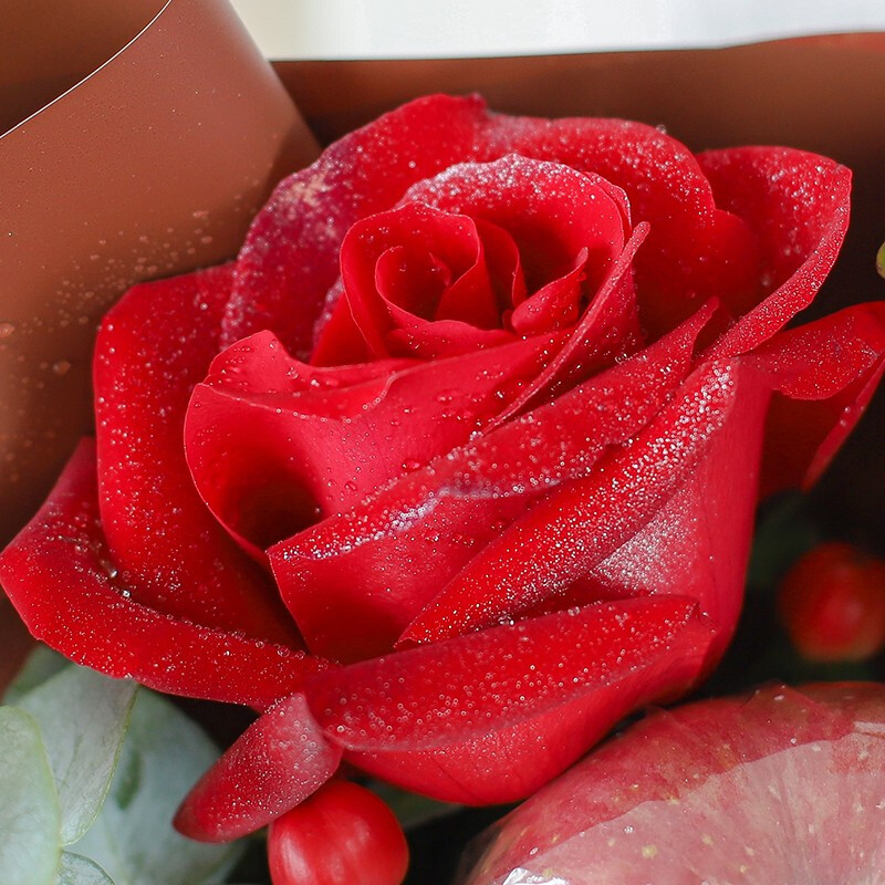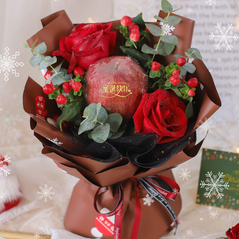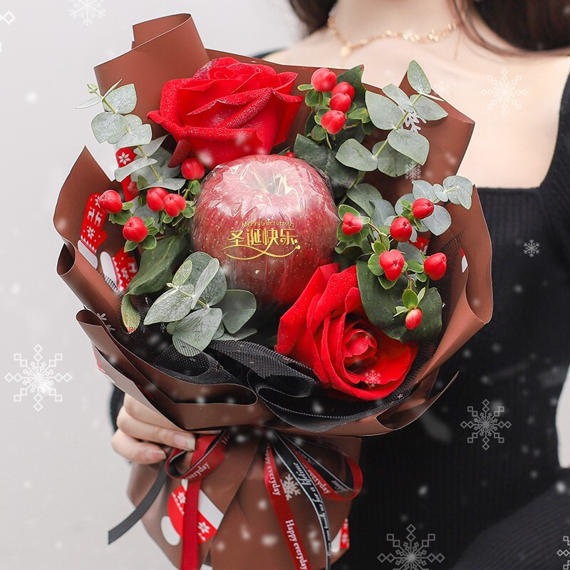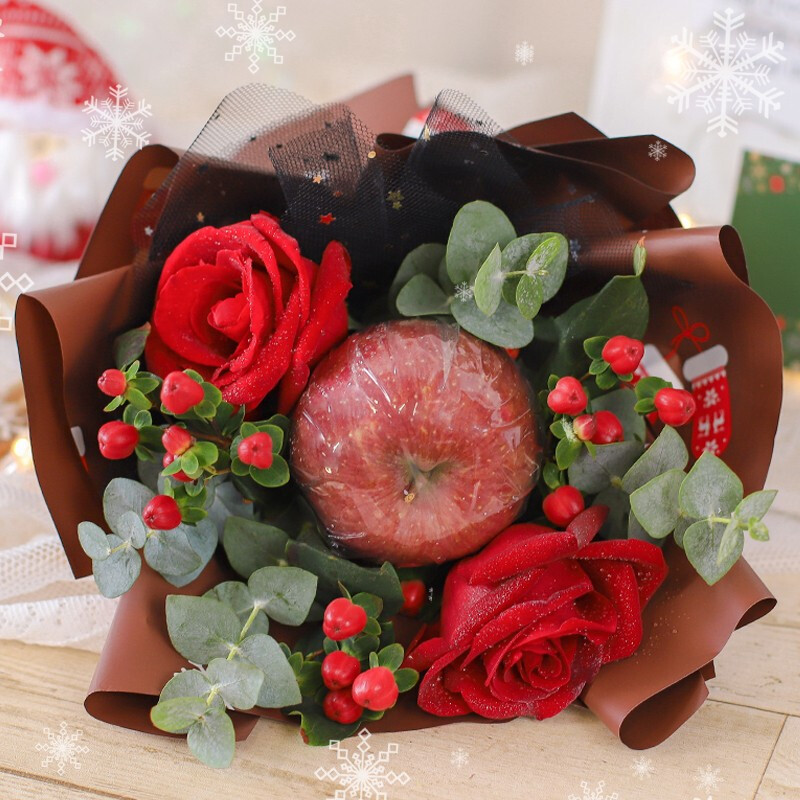 花 材:1个精美苹果,2枝卡罗拉红玫瑰搭配红豆,尤加利叶