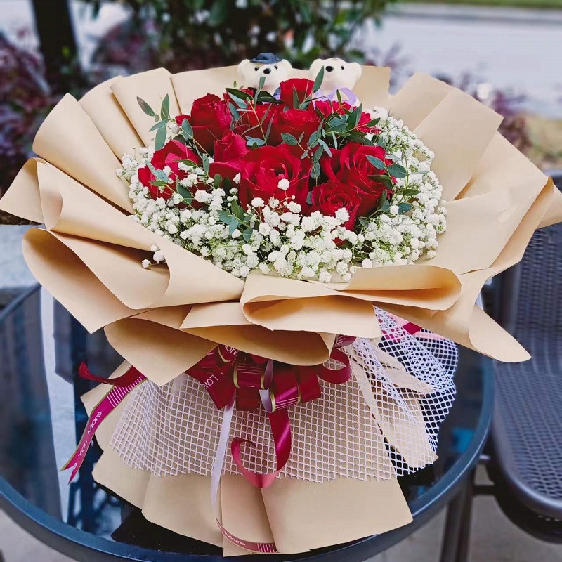 花 材:11支精品红玫瑰,2只可爱小熊,搭配尤加利叶,白色满天星外围环绕。