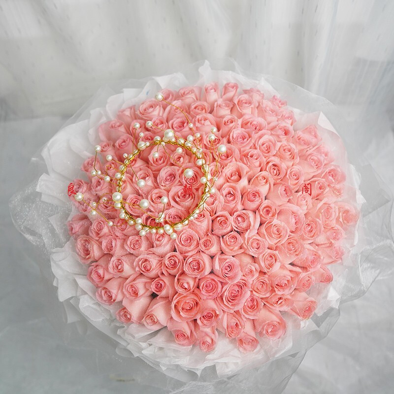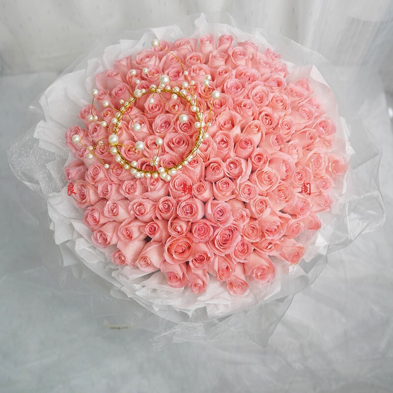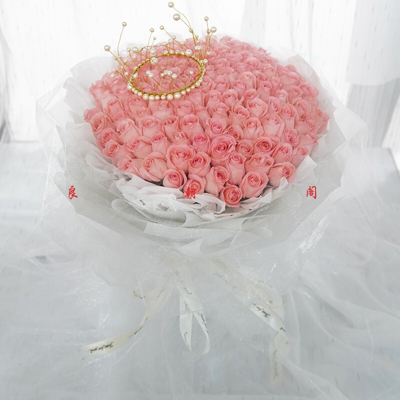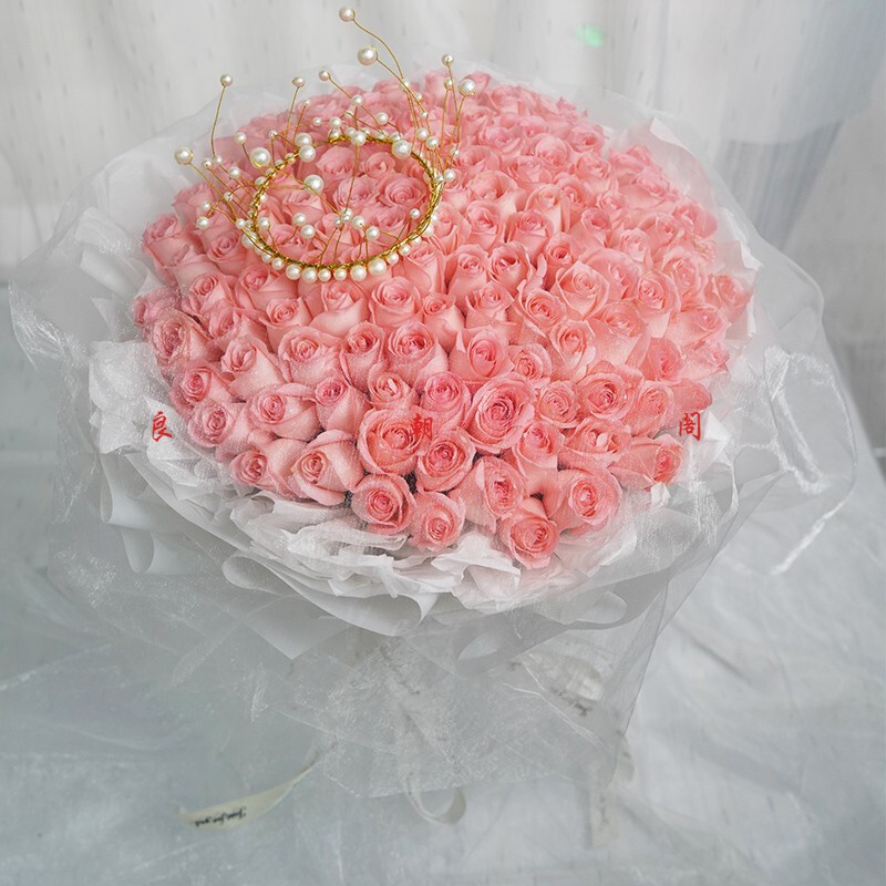 花材: 精选120朵粉玫瑰,搭配皇冠装饰 。