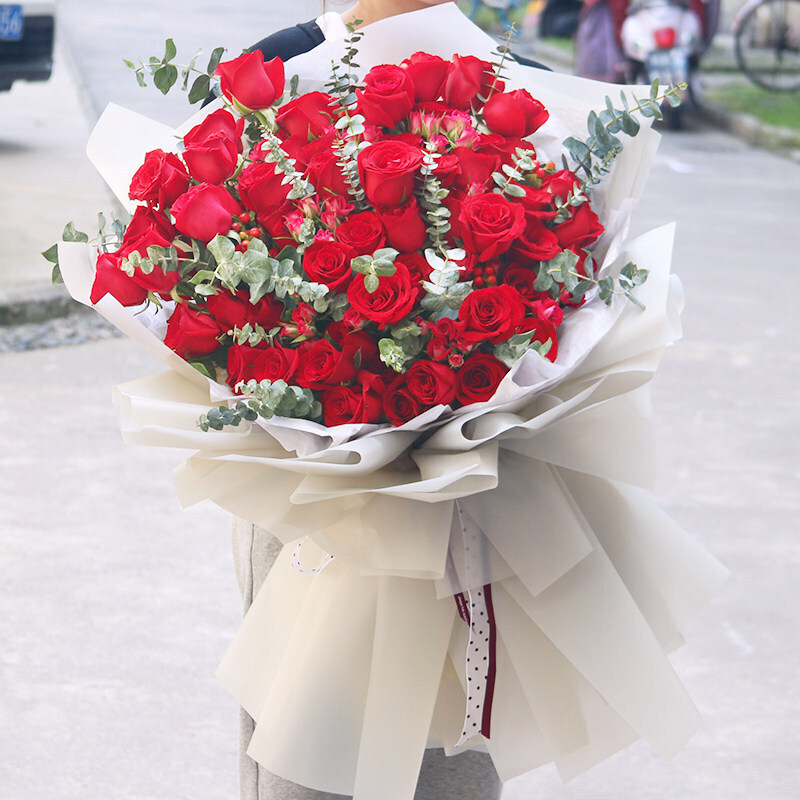 花材: 52朵红玫瑰,搭配尤加利叶装饰。