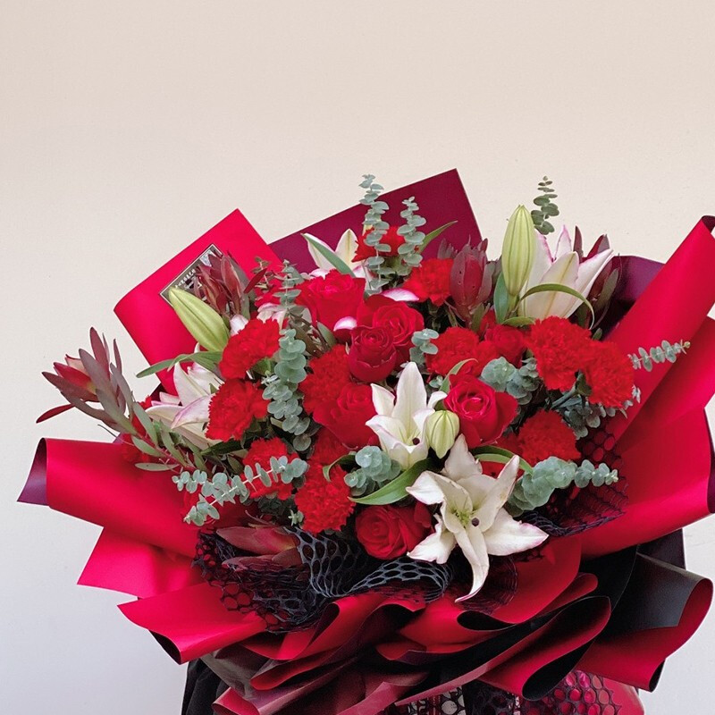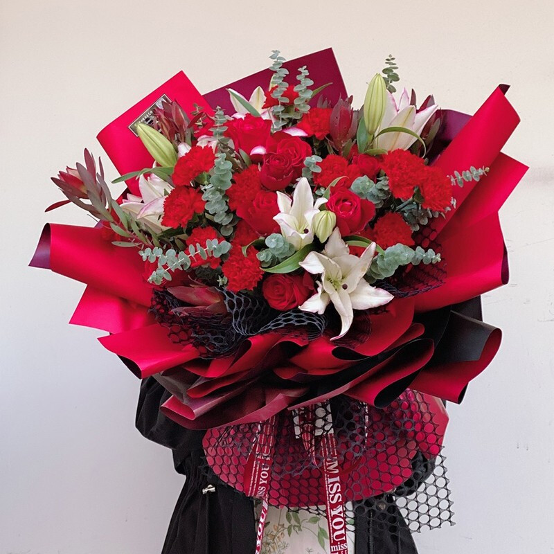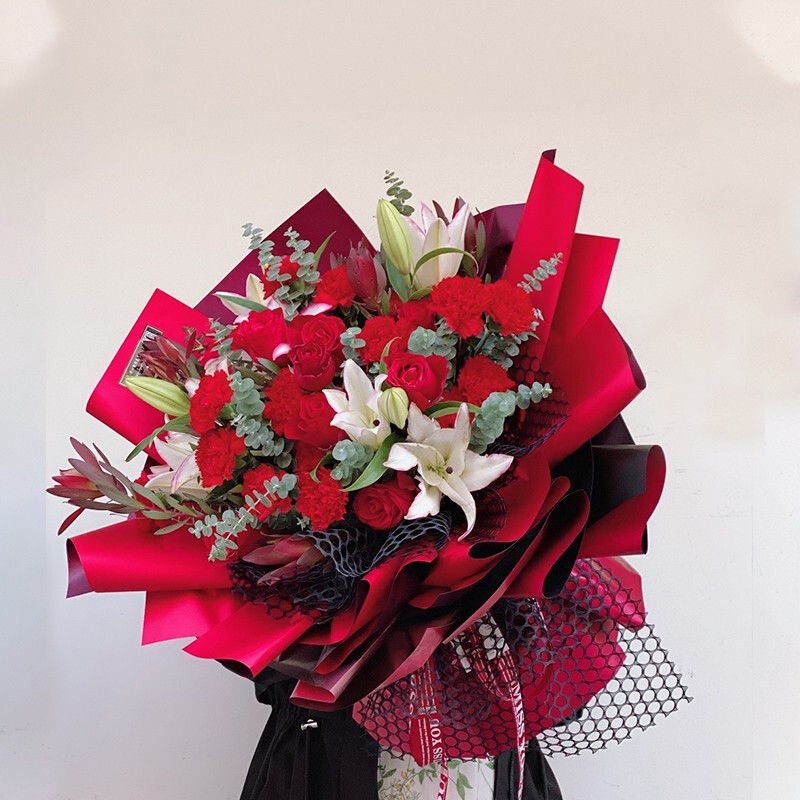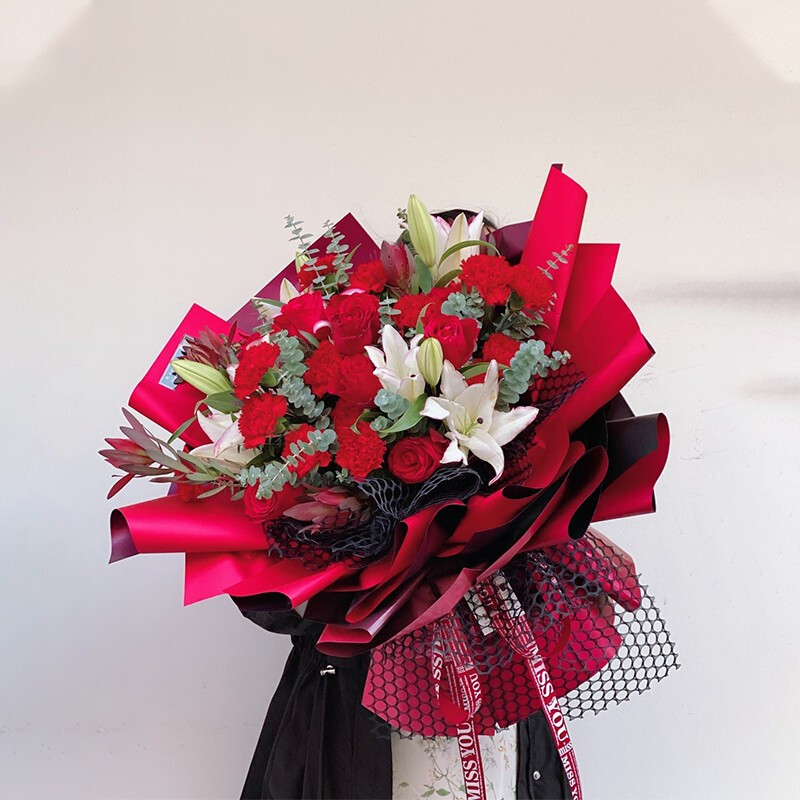 花材: 精选16朵红色康乃馨,6朵红玫瑰,3支白色多头香水百合,搭配尤加利叶等绿叶装饰。