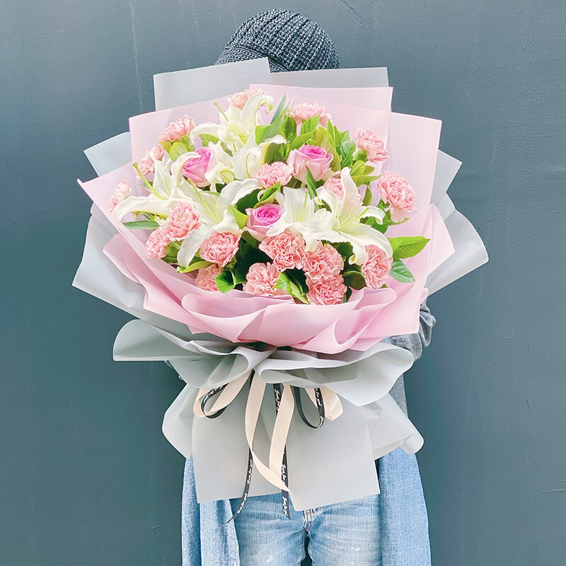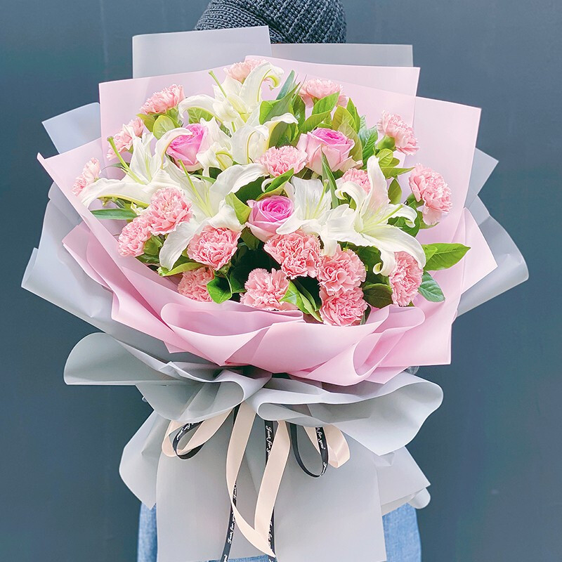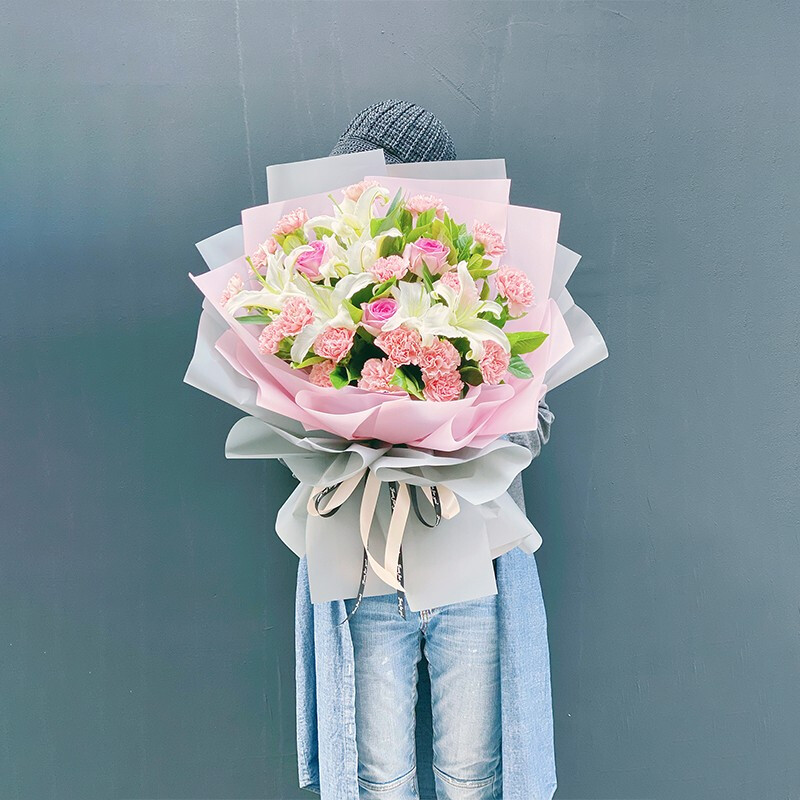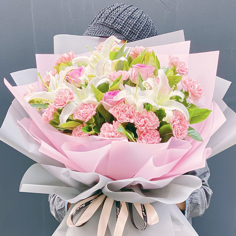 花 材:精选19朵粉色康乃馨,3朵粉玫瑰,2支多头白色香水百合,搭配栀子叶等绿叶装饰。
