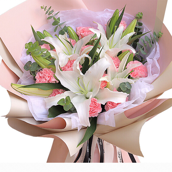 花 材:19朵粉色康乃馨,3枝多头白百合,尤加利间插