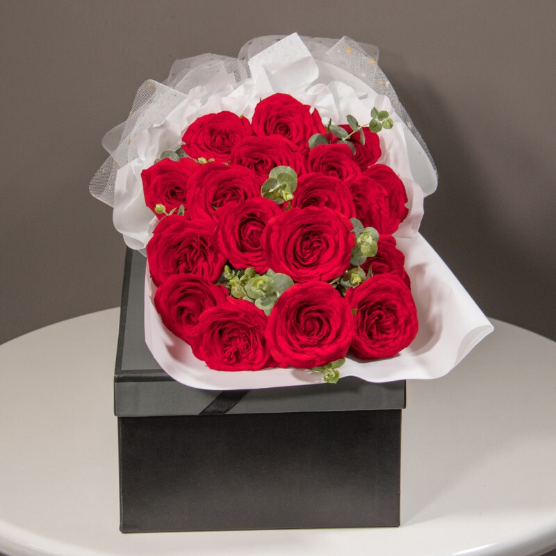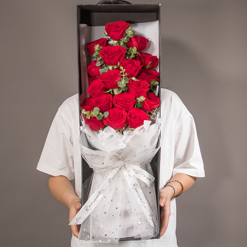 花 材:精选19朵红色玫瑰,搭配尤加利叶装饰。