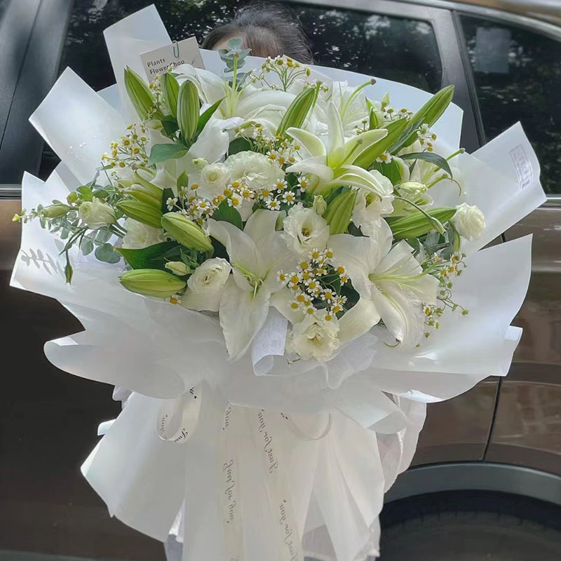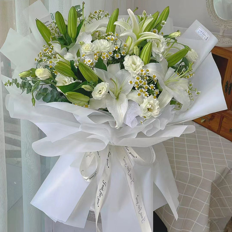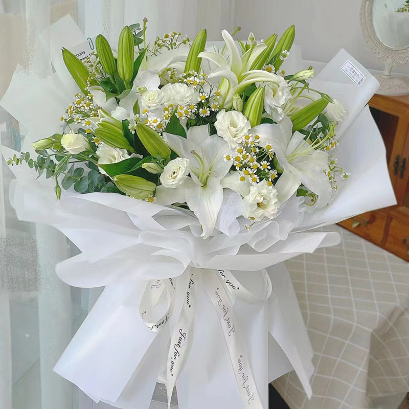 花 材:6支(约16朵)白色多头香水百合,搭配6支洋桔梗,洋甘菊,尤加利叶装饰。