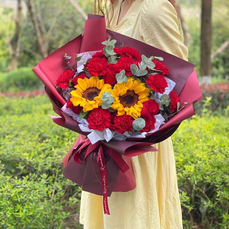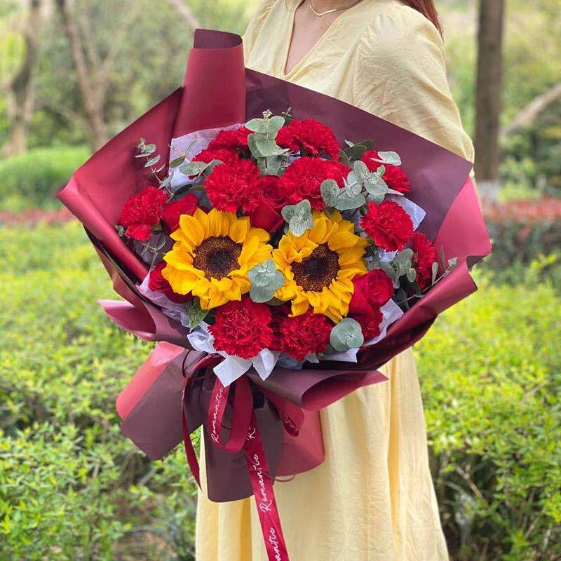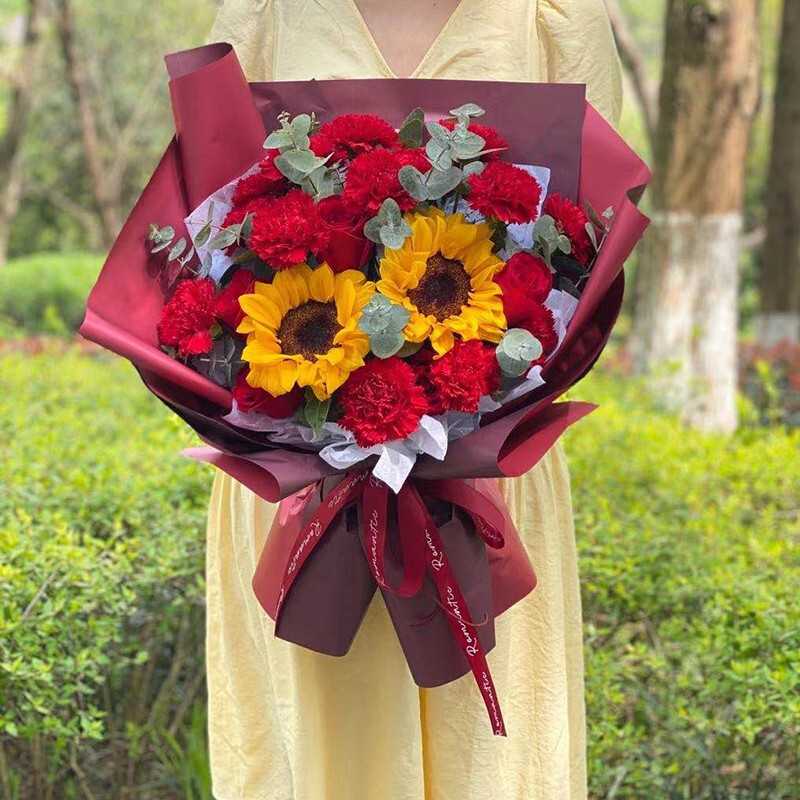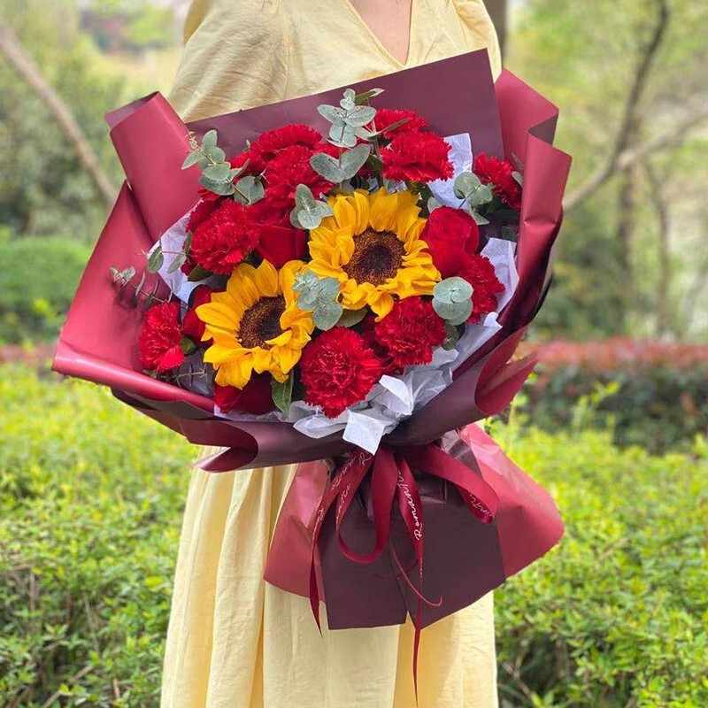 花材: 12朵红色康乃馨,5朵红玫瑰,2支向日葵,搭配尤加利装饰。
