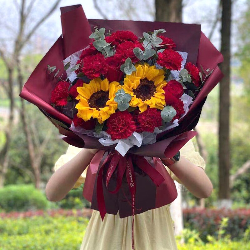 花 材:12朵红色康乃馨,5朵红玫瑰,2支向日葵,搭配尤加利装饰。