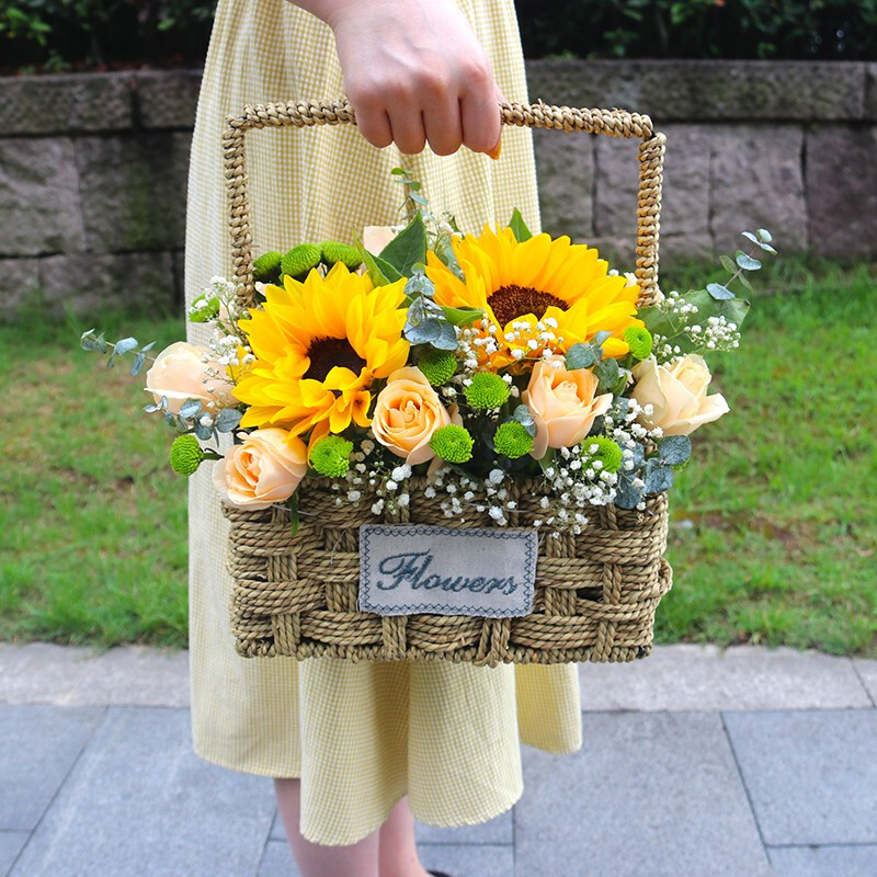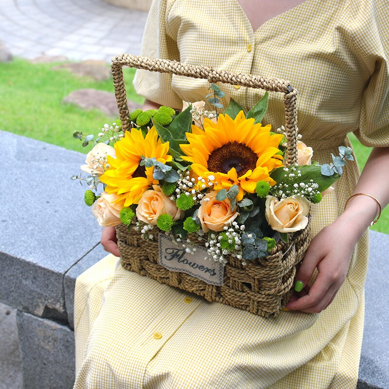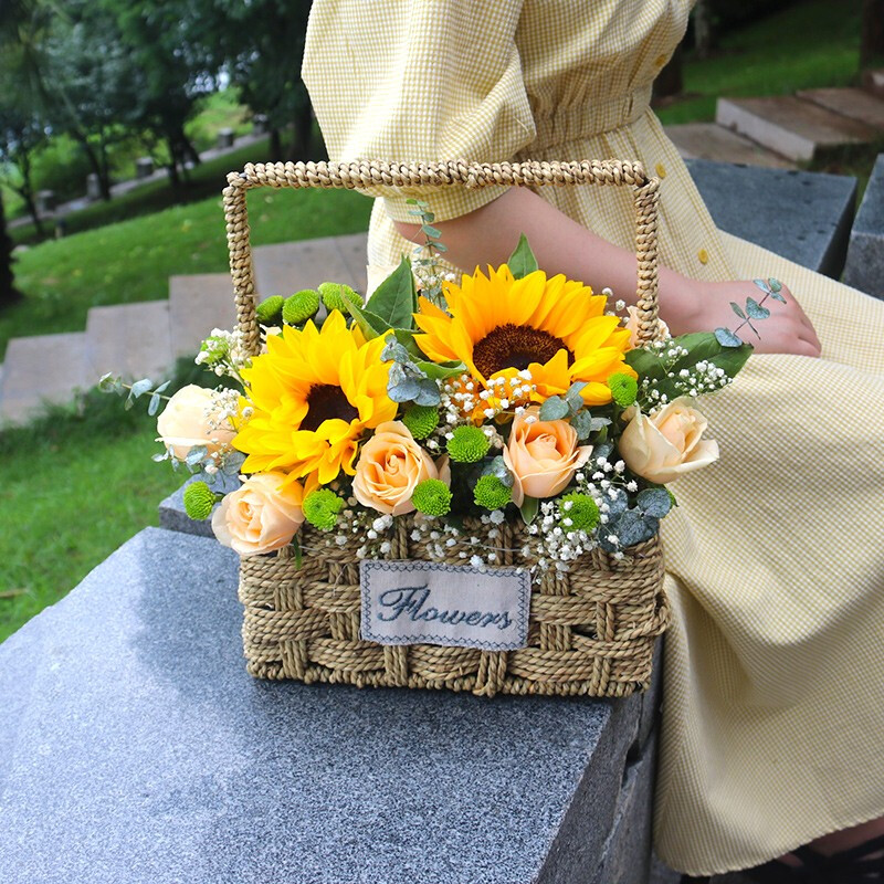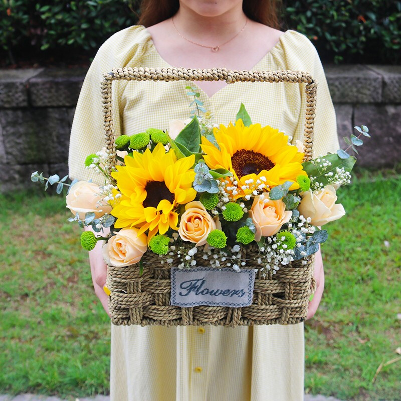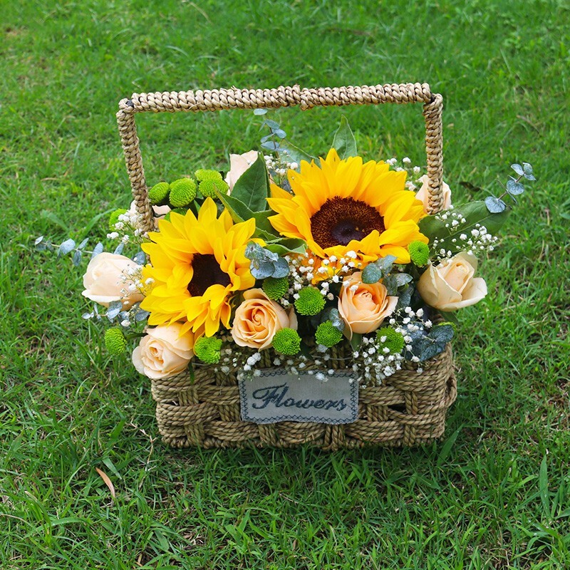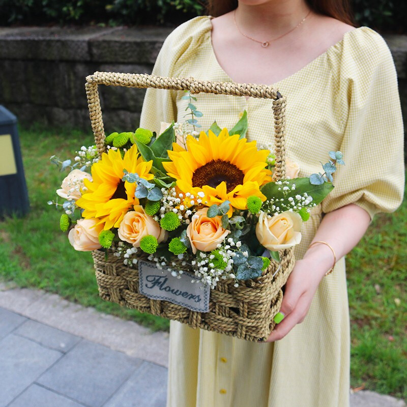 花材: 6朵香槟玫瑰,2支向日葵,绿色小雏菊,白色满天星,尤加利叶,吕特装饰。
