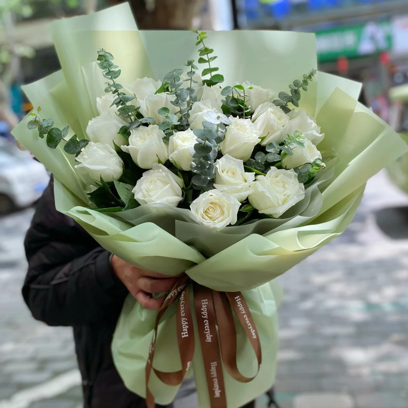 花 材:19朵白玫瑰,搭配尤加利叶装饰。