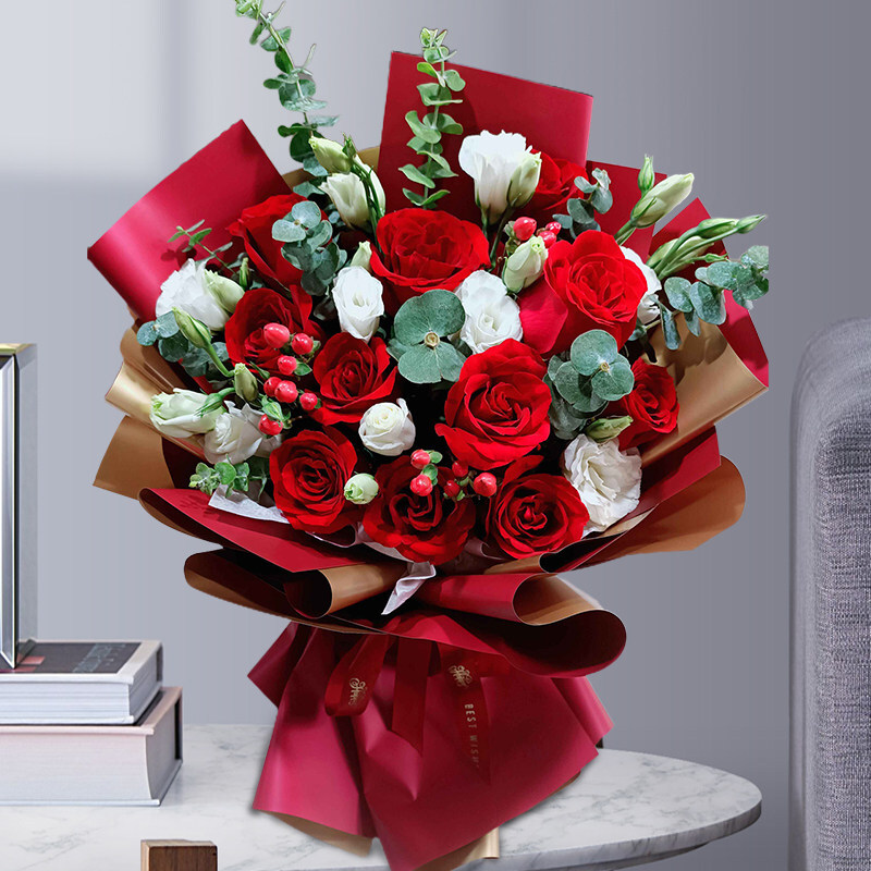 花材: 11朵红色玫瑰,搭配6支白色洋桔梗(断货则用6朵白玫瑰代替),搭配尤加利叶、红豆装饰。