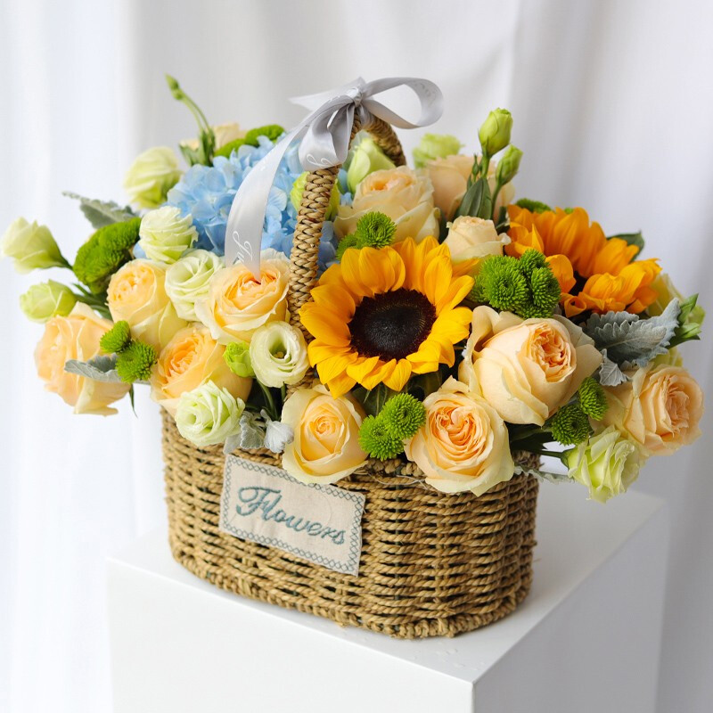 花 材:精选1支蓝色绣球花,11朵精品香槟玫瑰,2支向日葵,搭配洋桔梗,绿色小雏菊,银叶菊装饰,银灰色丝带花结点缀。