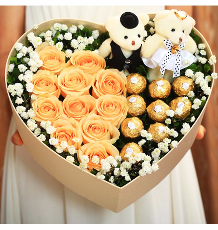 花 材:11朵精品香槟玫瑰,11朵费列罗,2只可爱小熊,满天星、栀子叶装饰。