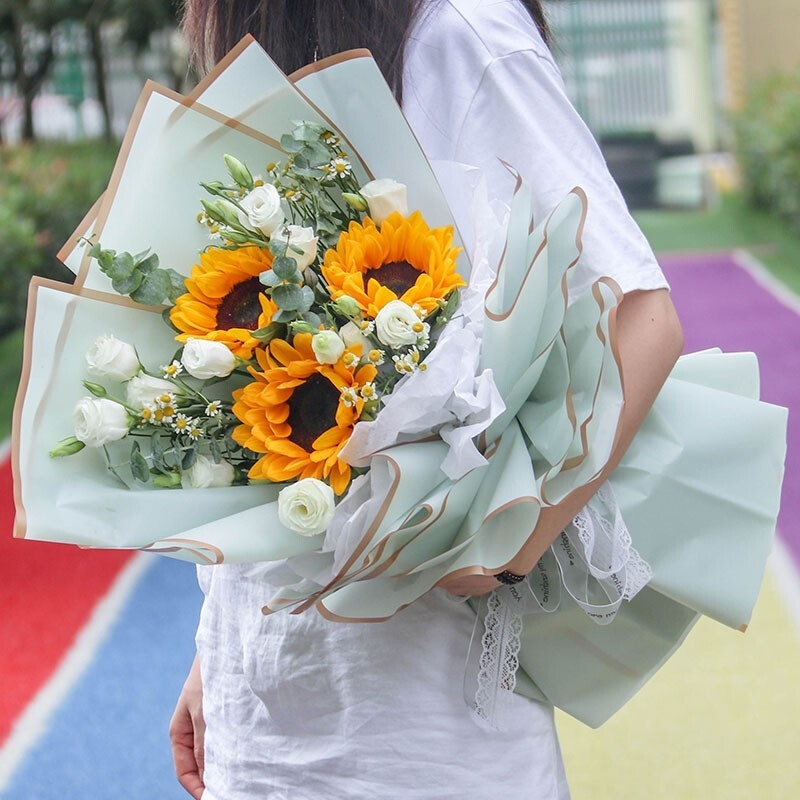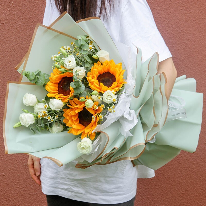 包 装:白色雪梨纸内衬,淡绿色雾面纸多层扇形包扎,白色丝带花结。