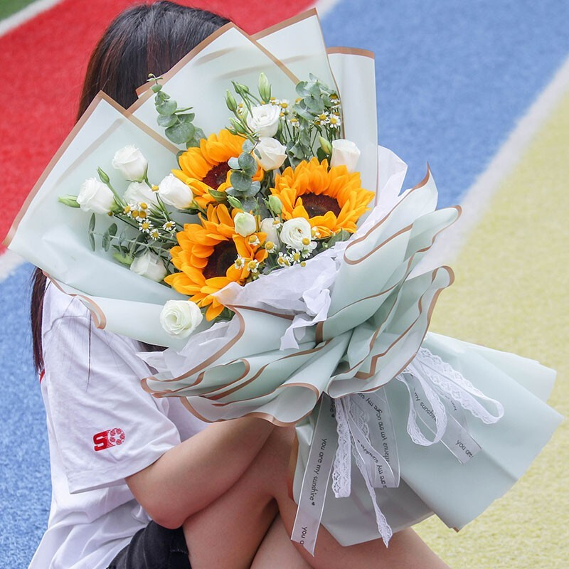 花 材:3朵向日葵,6支白色洋桔梗(可用6支白玫瑰代替),搭配小雏菊,尤加利叶装饰。