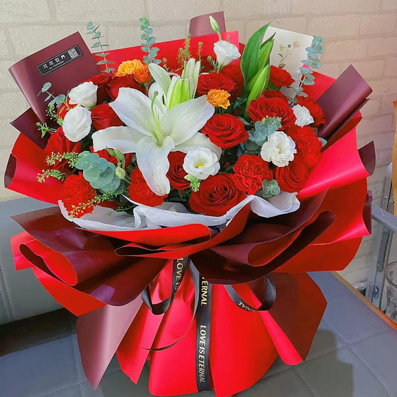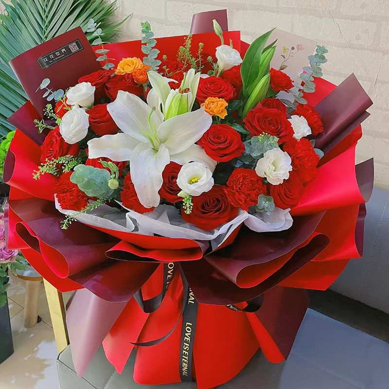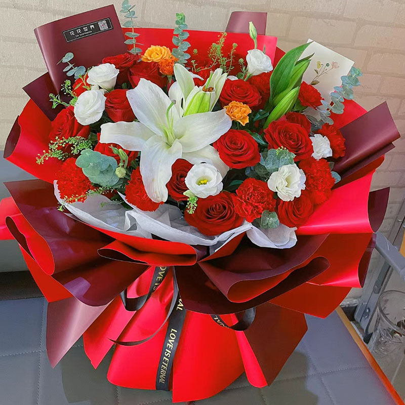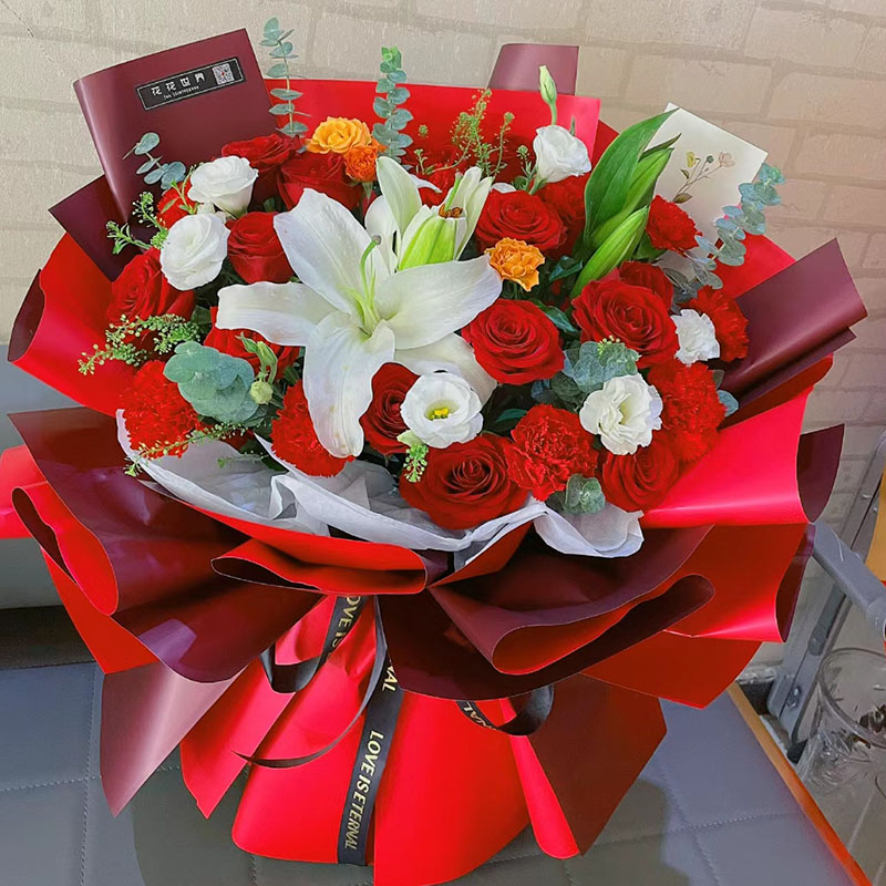 花材: 红玫瑰和红色康乃馨混搭共19朵,1支多头白色香水百合,搭配白色洋桔梗、多头橙色小玫瑰、尤加利叶、黄莺草等装饰。