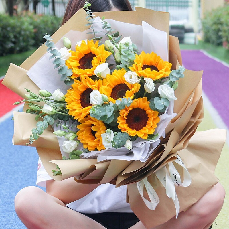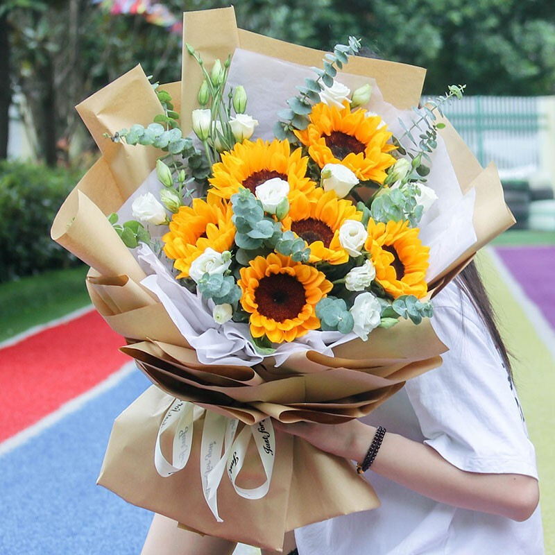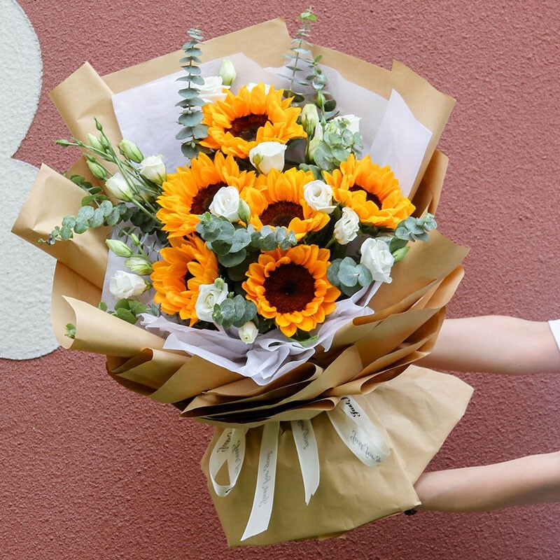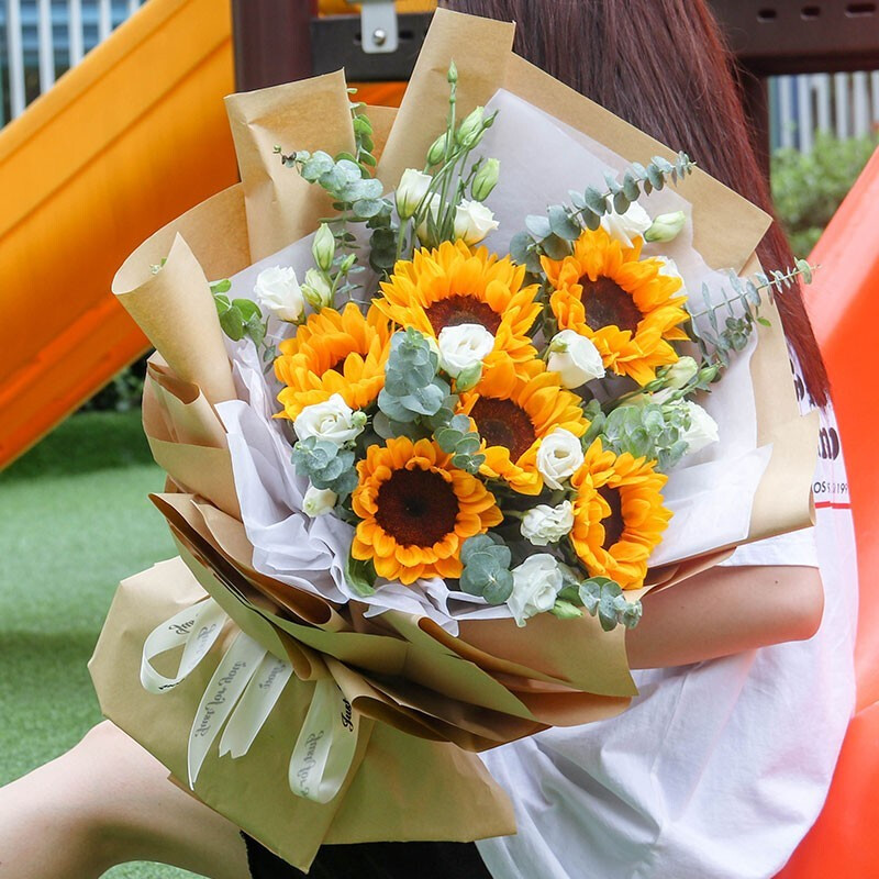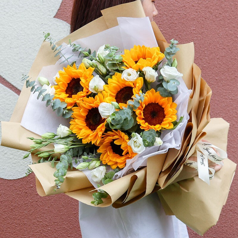 花 材:6支精品向日葵,搭配6支白色洋桔梗,尤加利叶装饰。