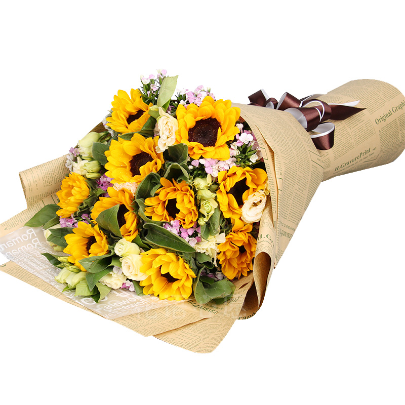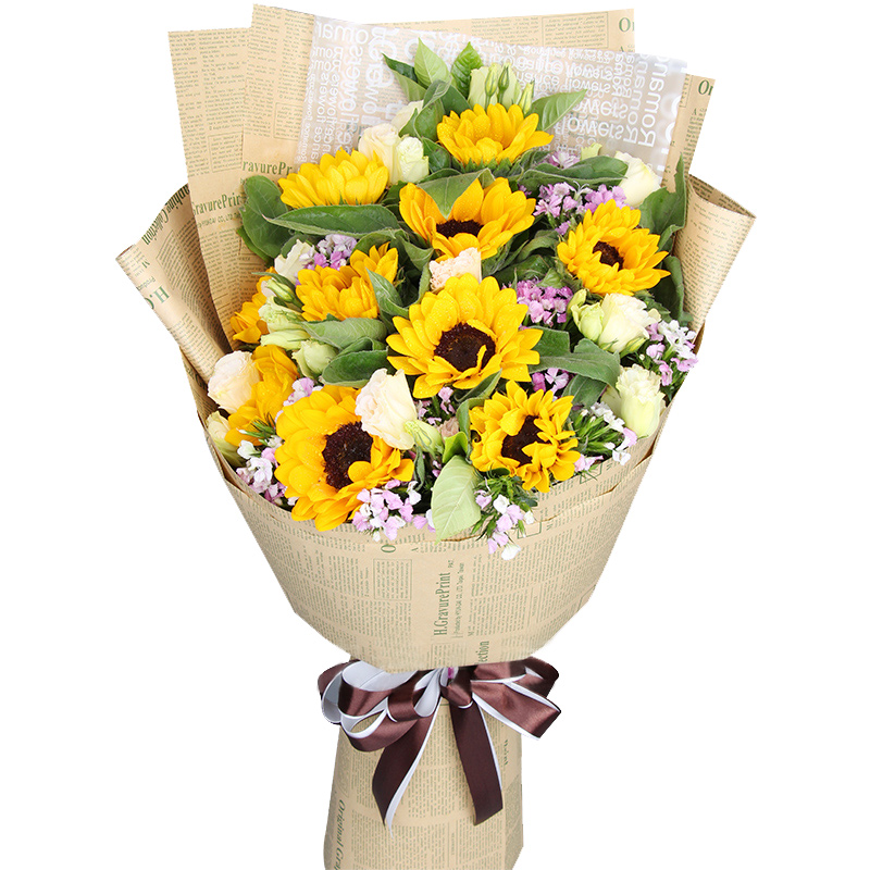 花材: 10朵向日葵,搭配桔梗、相思梅、栀子叶丰满点缀。