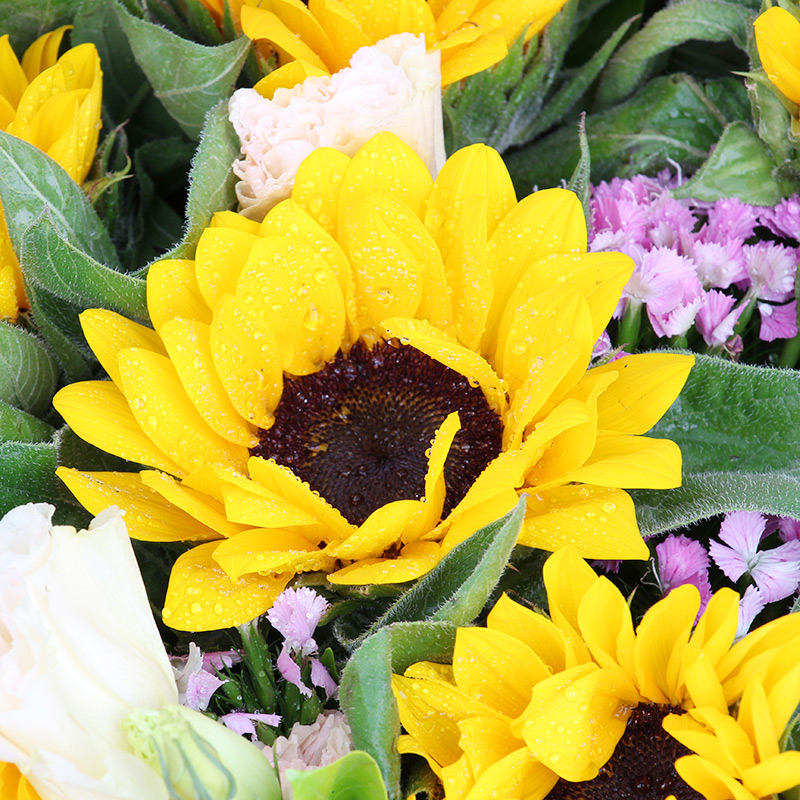 花 材:10朵向日葵,搭配桔梗、相思梅、栀子叶丰满点缀。
