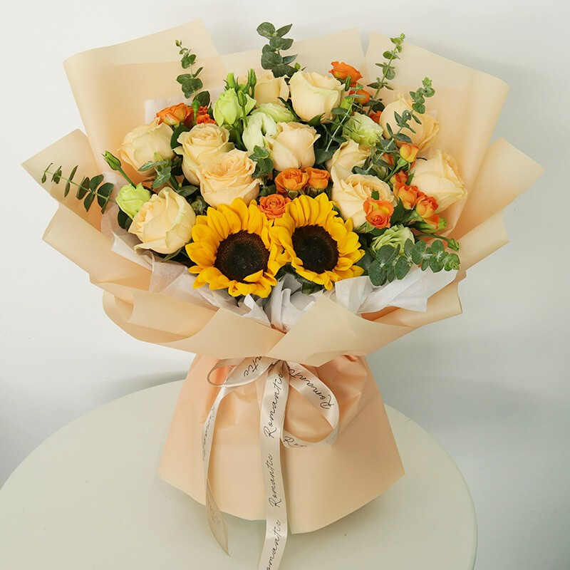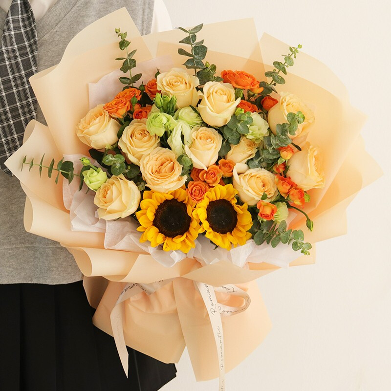 花材: 11朵香槟玫瑰,2朵向日葵,4支多头橙色小玫瑰,搭配洋桔梗,尤加利叶装饰。