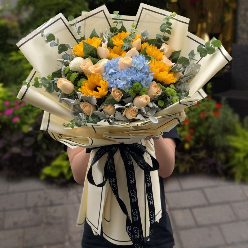 花材: 16朵香槟玫瑰,5朵向日葵,1支蓝色绣球花,搭配小雏菊,银叶菊,尤加利叶装饰。