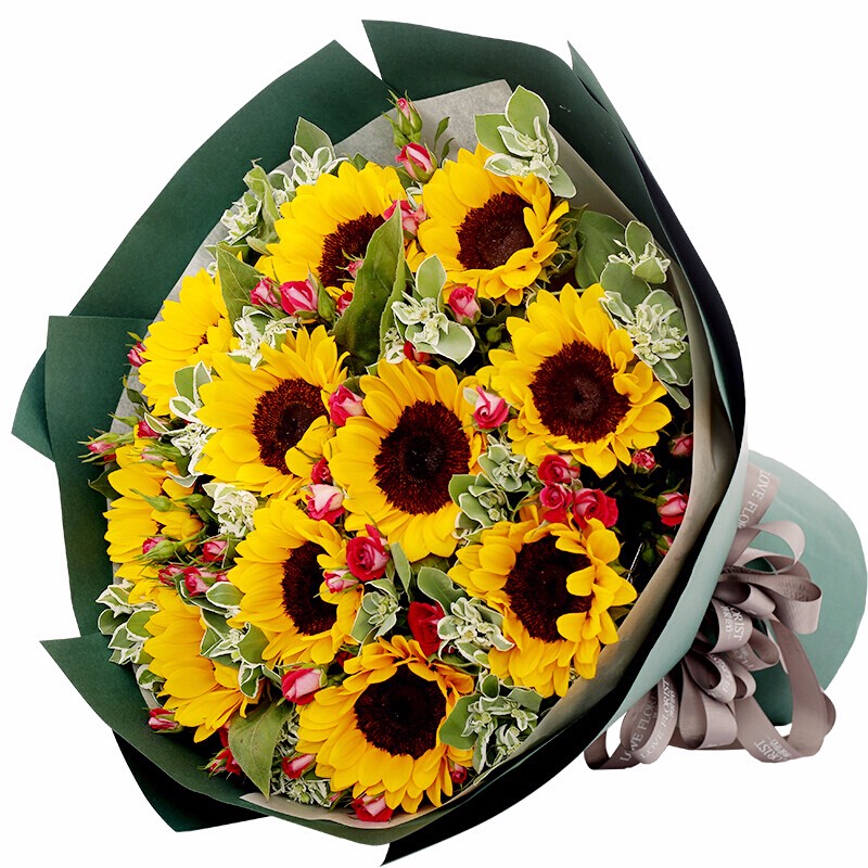 花材: 精选11支向日葵,搭配砖石玫瑰、高山积雪丰满点缀。