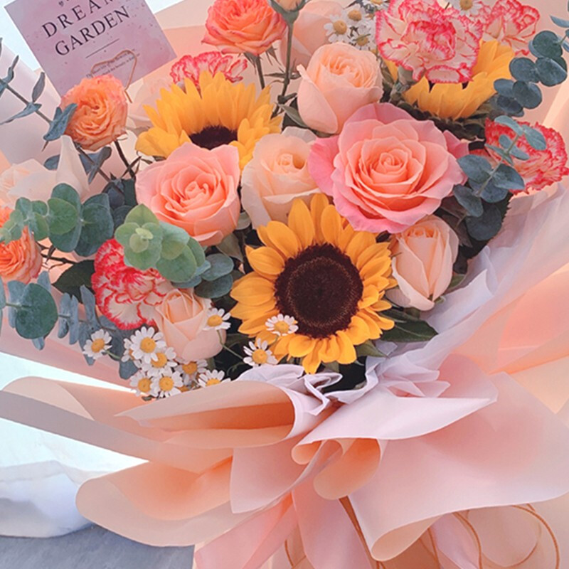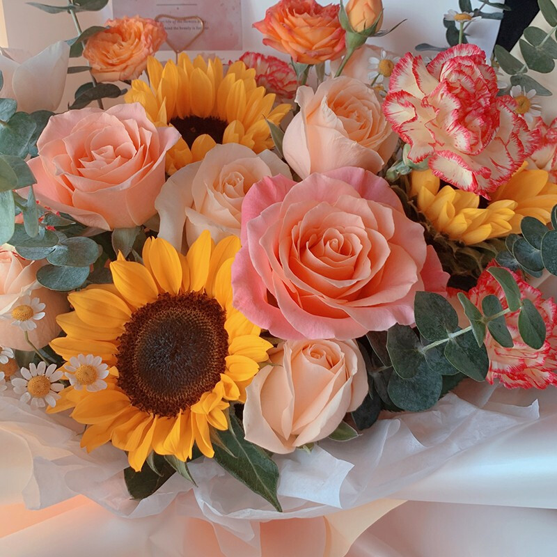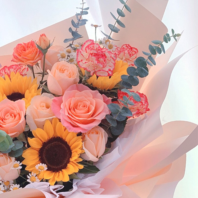 花 材:3支向日葵,8朵粉色系玫瑰混搭,3支粉色多头康乃馨,2支橙色多头小玫瑰,搭配洋甘菊,尤加利叶装饰。