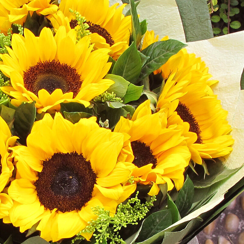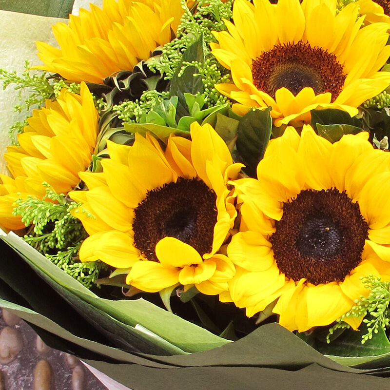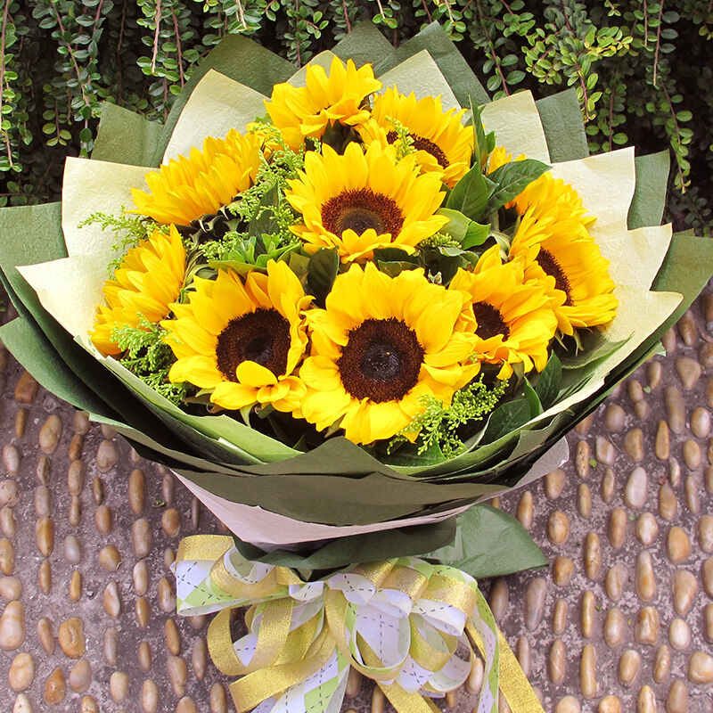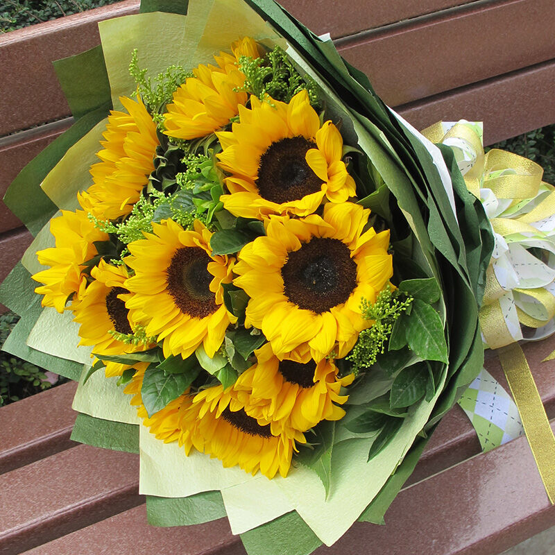 花材: 10枝向日葵,搭配黄莺、绿叶。