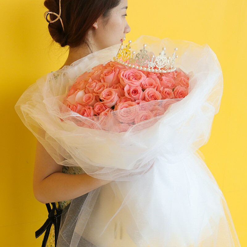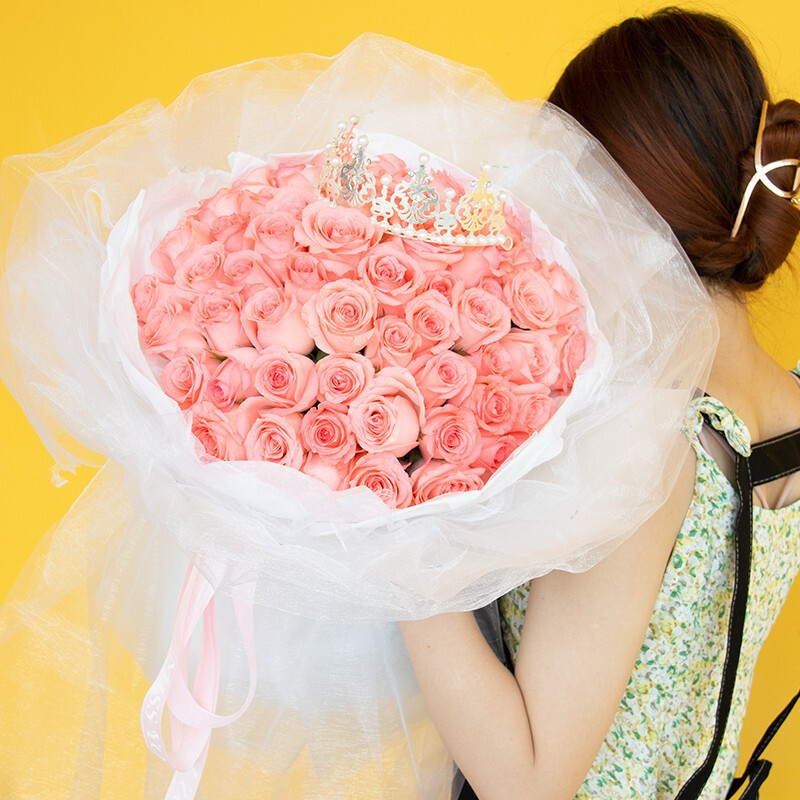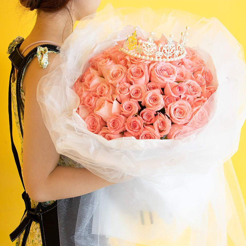 花 材:33朵精品粉玫瑰,搭配皇冠装饰。