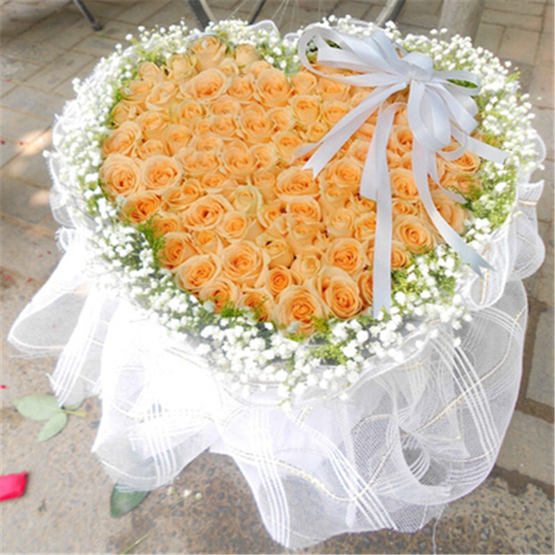 花 材:精选99朵香槟玫瑰,白色缎带花结装饰花面,整体花束心形造型,搭配黄英、白色满天星外围环绕。