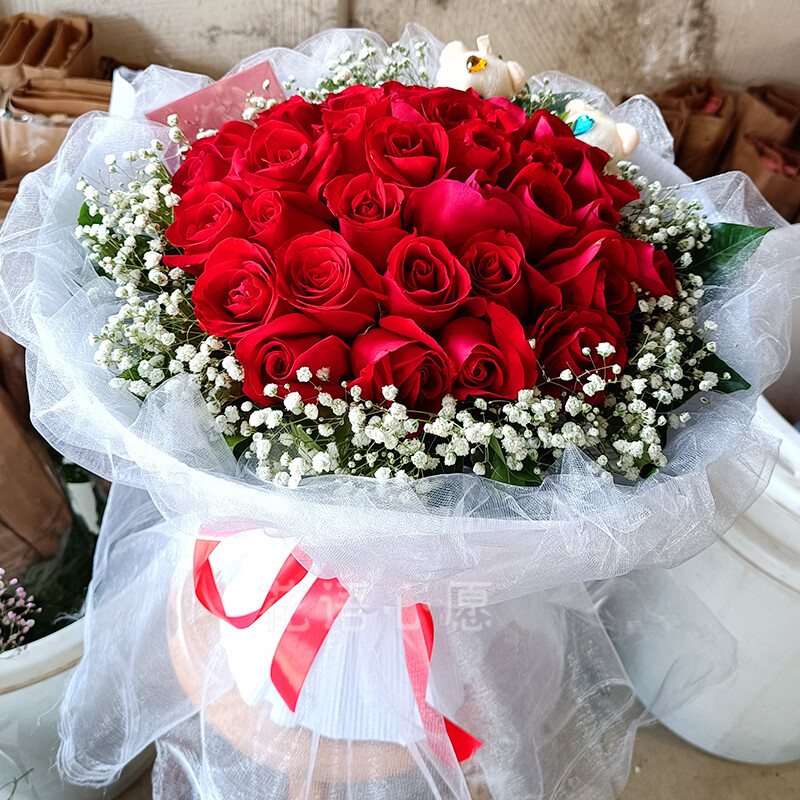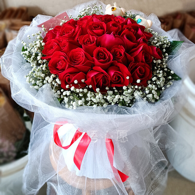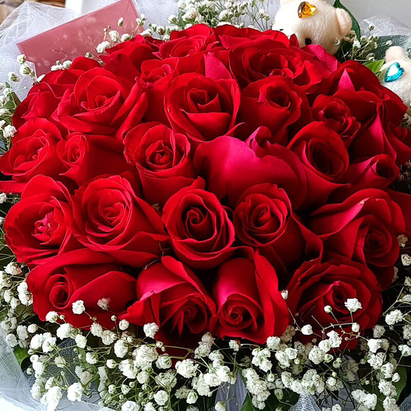花 材:33朵精品红玫瑰,2只小熊,搭配满天星、栀子叶外围丰满环绕。