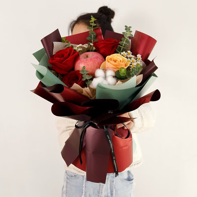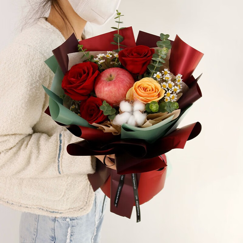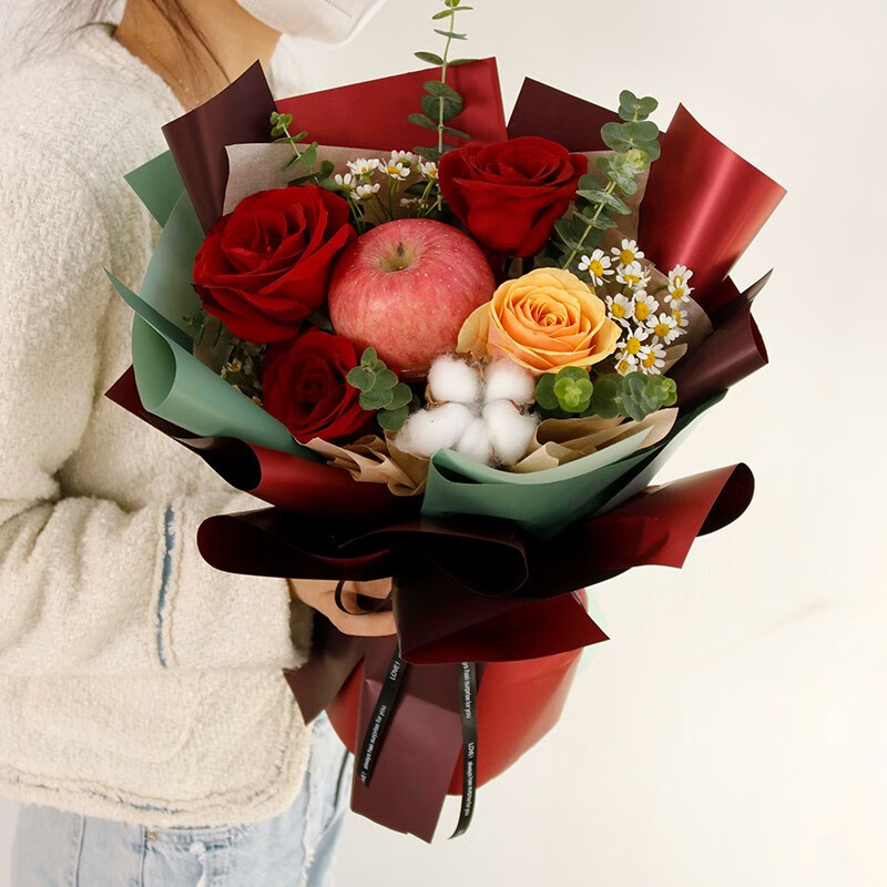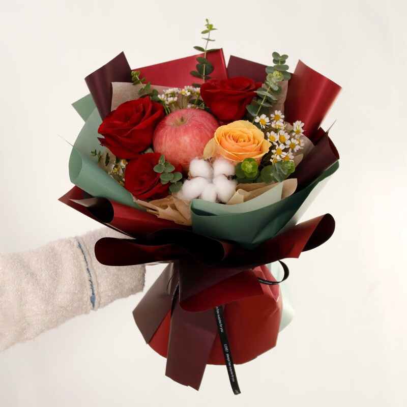 花 材: 1颗苹果,3朵红玫瑰,1朵香槟玫瑰,1颗棉花(可用白玫瑰代替),搭配小雏菊,尤加利叶装饰。
