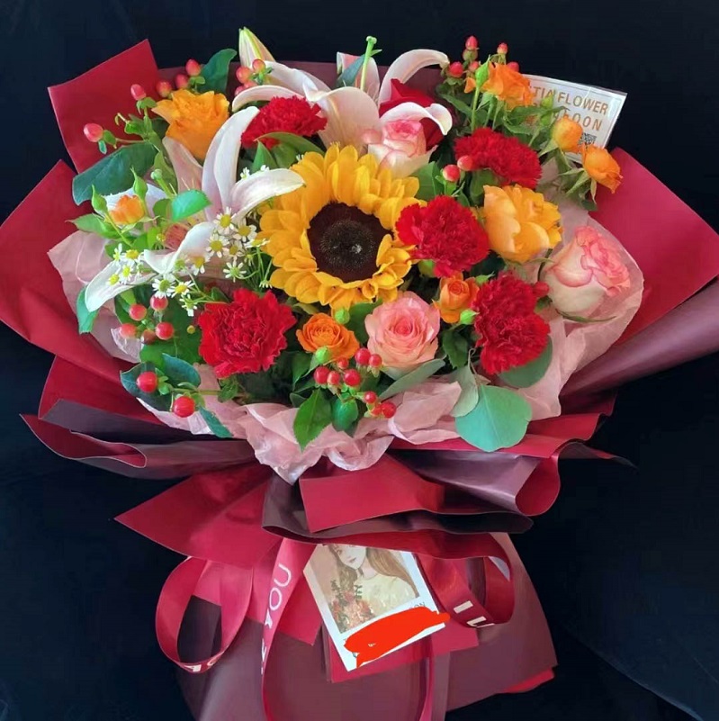 花 材:11朵玫瑰康乃馨混搭(红色康乃馨,粉玫瑰,香槟玫瑰),1支向日葵,2支多头百合,搭配红豆、多头橙色小玫瑰、尤加利叶装饰。