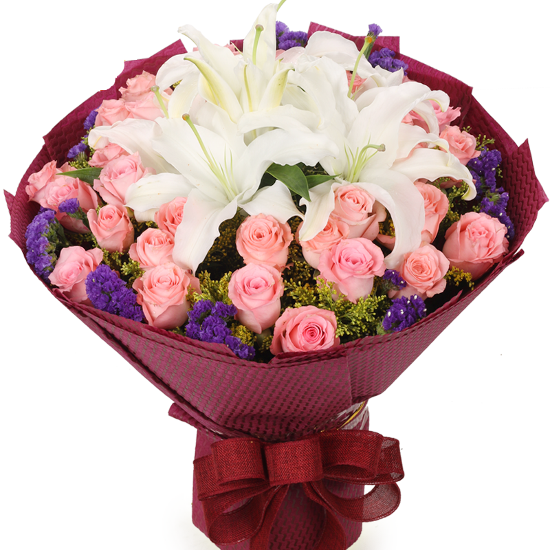 花 材:精选33朵粉玫瑰,6朵香水百合,搭配黄莺、勿忘我间插点缀。