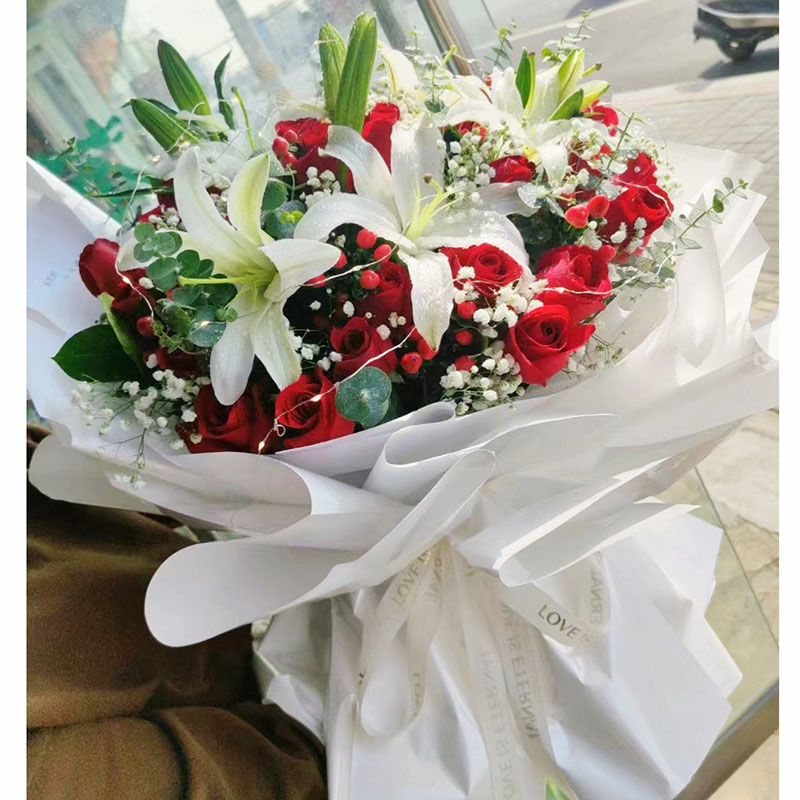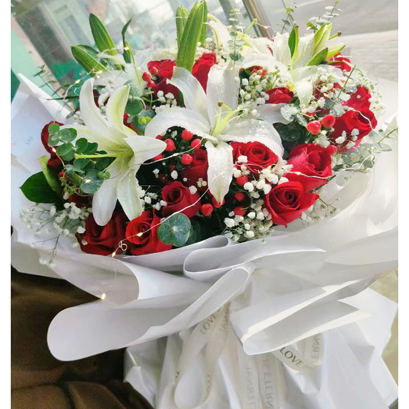 花材: 19朵红玫瑰,1条灯带,4支白色多头香水百合,搭配尤加利叶、火龙珠间插。