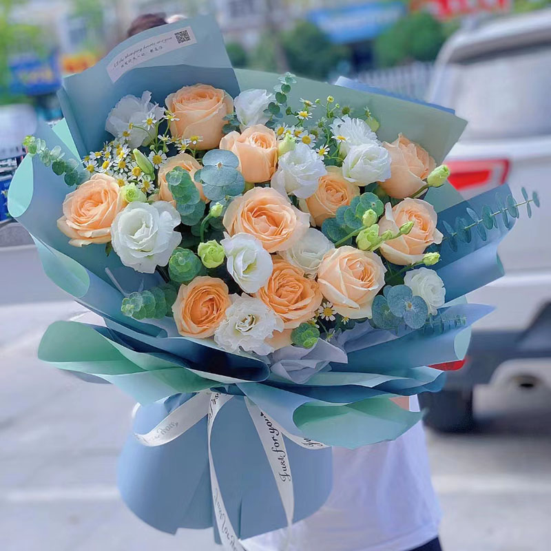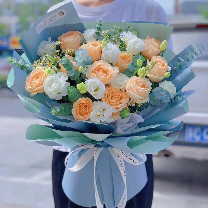 花材: 11朵香槟色玫瑰,搭配6支白色洋桔梗(断货则用6朵白玫瑰代替),尤加利叶、洋甘菊装饰。