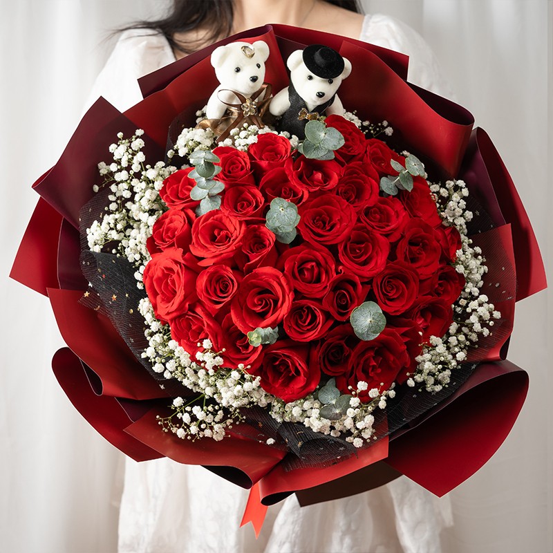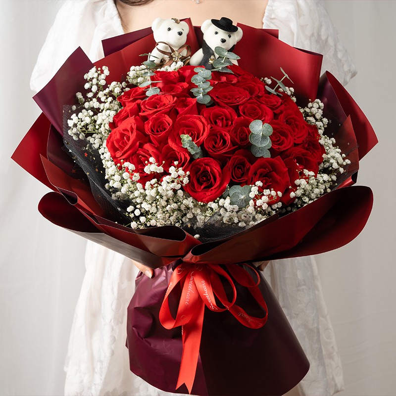 花材: 精选33枝红色卡罗拉玫瑰,2只可爱小熊(款式随机),搭配白色满天星、尤加利叶环绕。