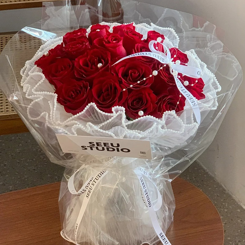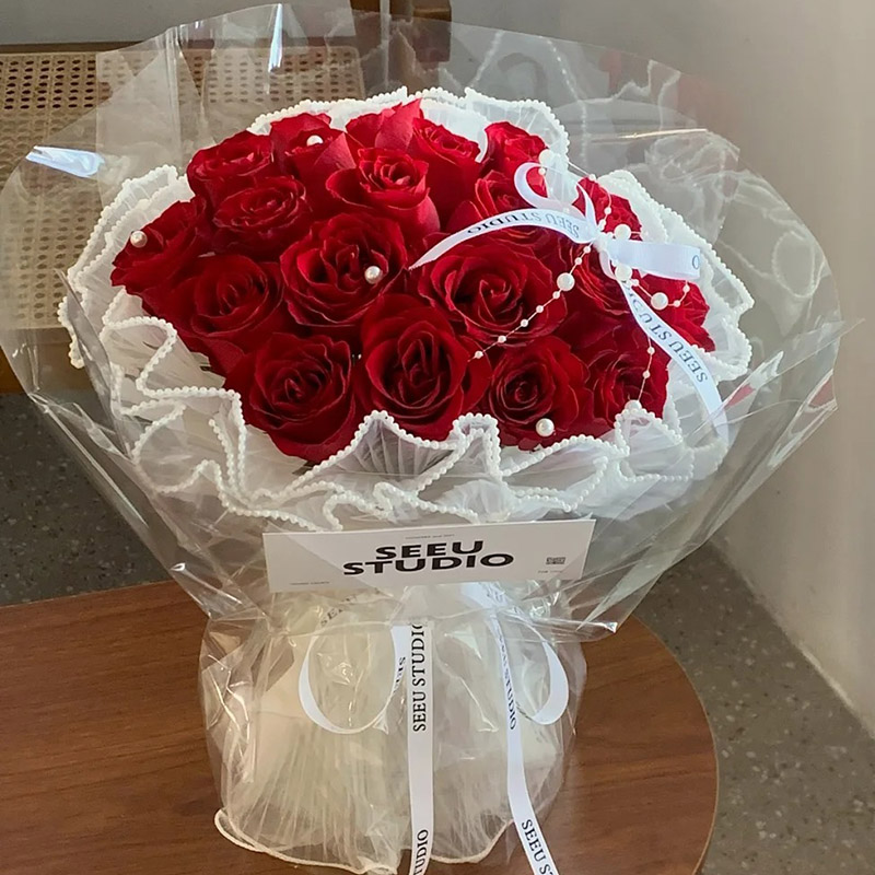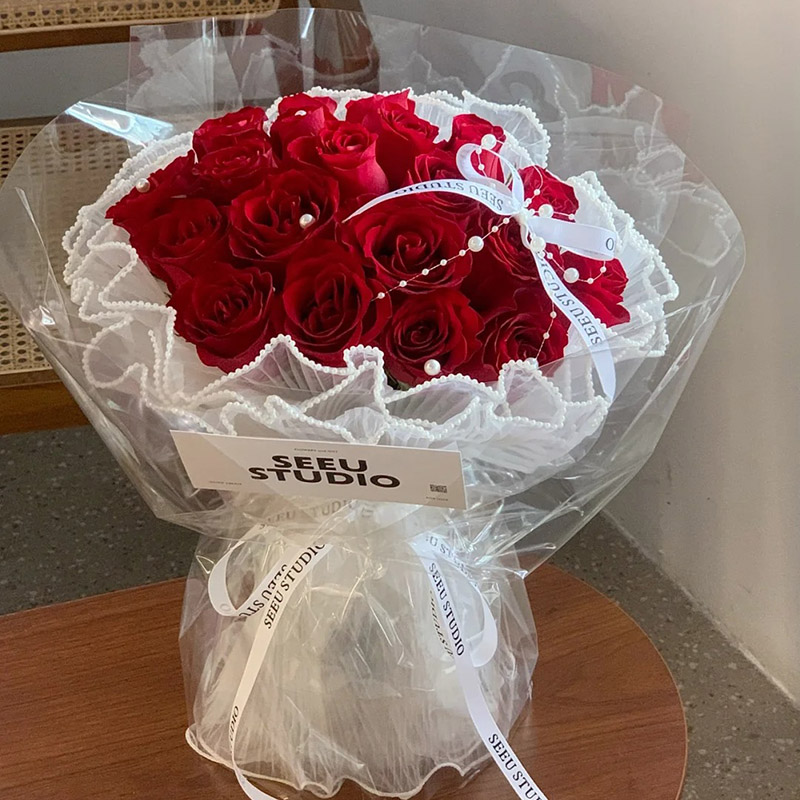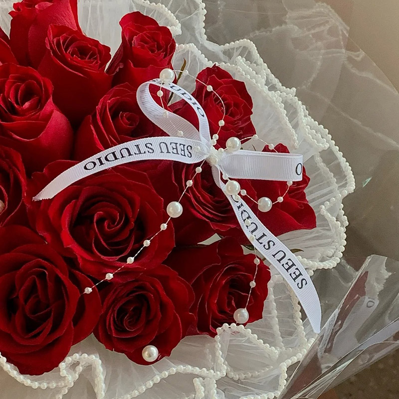 花 材:19朵红玫瑰,搭配珍珠、蝴蝶结,珠串装饰花面。